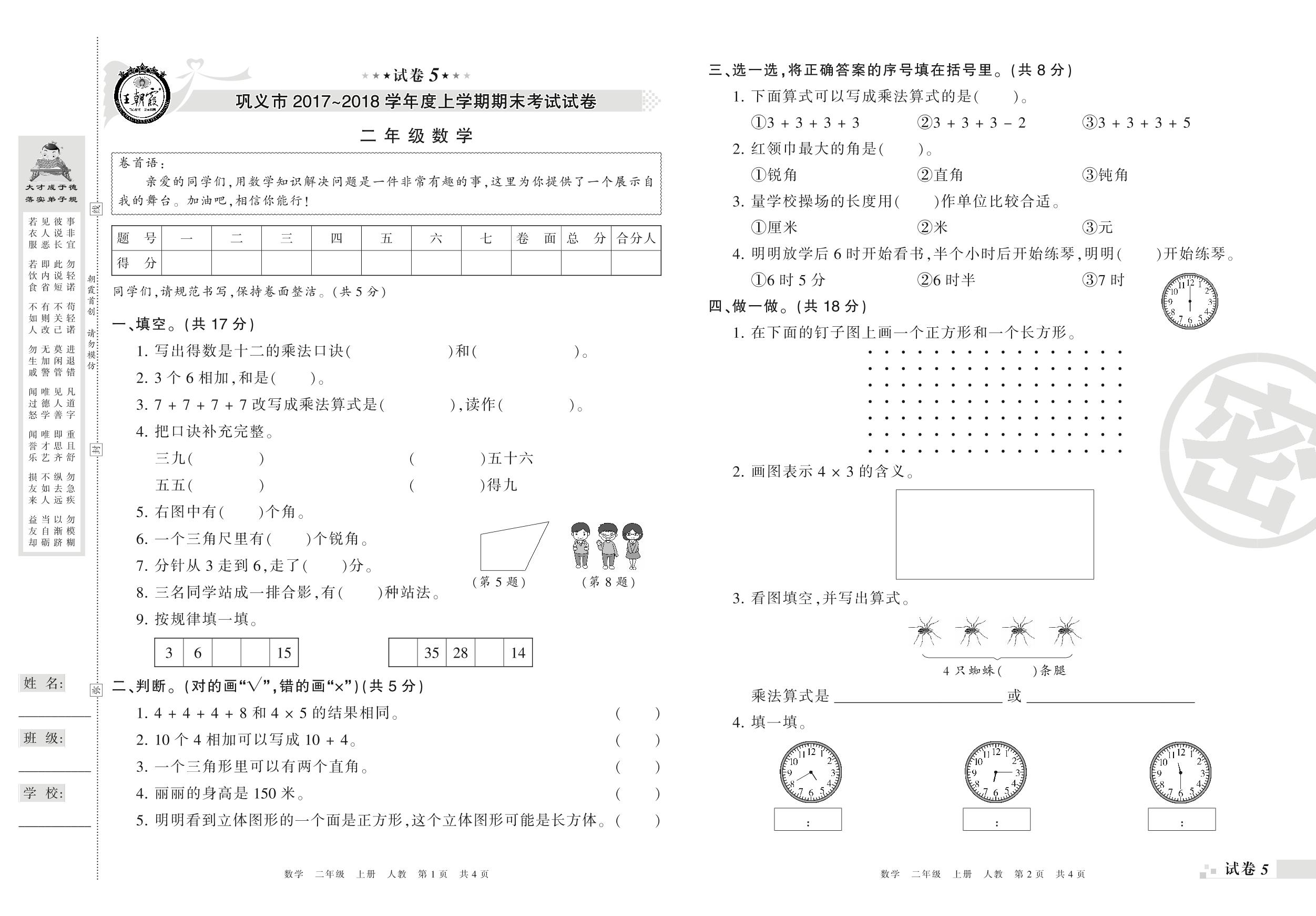 2017-2018学年第一学期巩义市二年级数学试卷(人教版)【5】