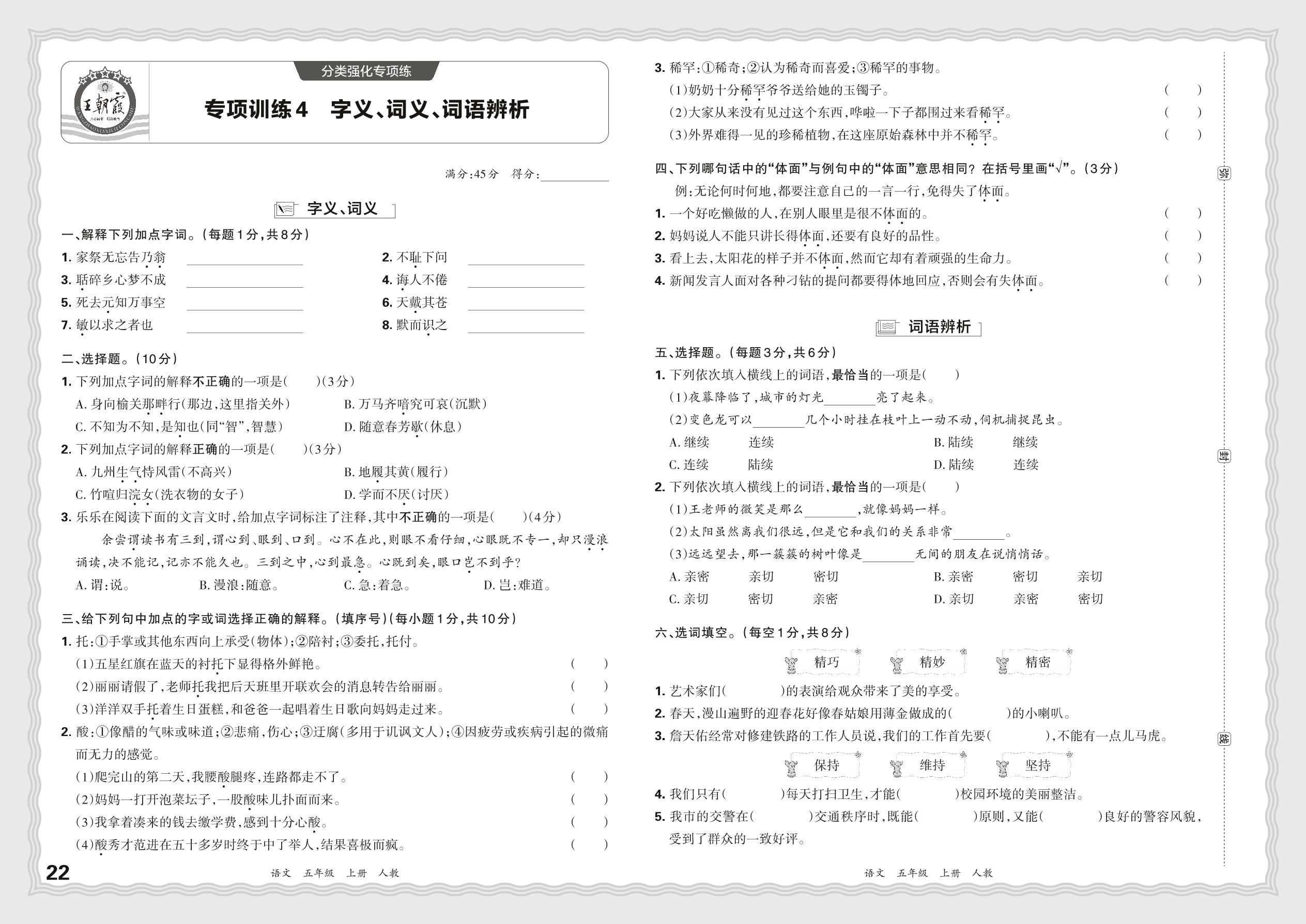 2023秋上册五年级语文人教版 期末专项·字义、词义、词语辨析【4】