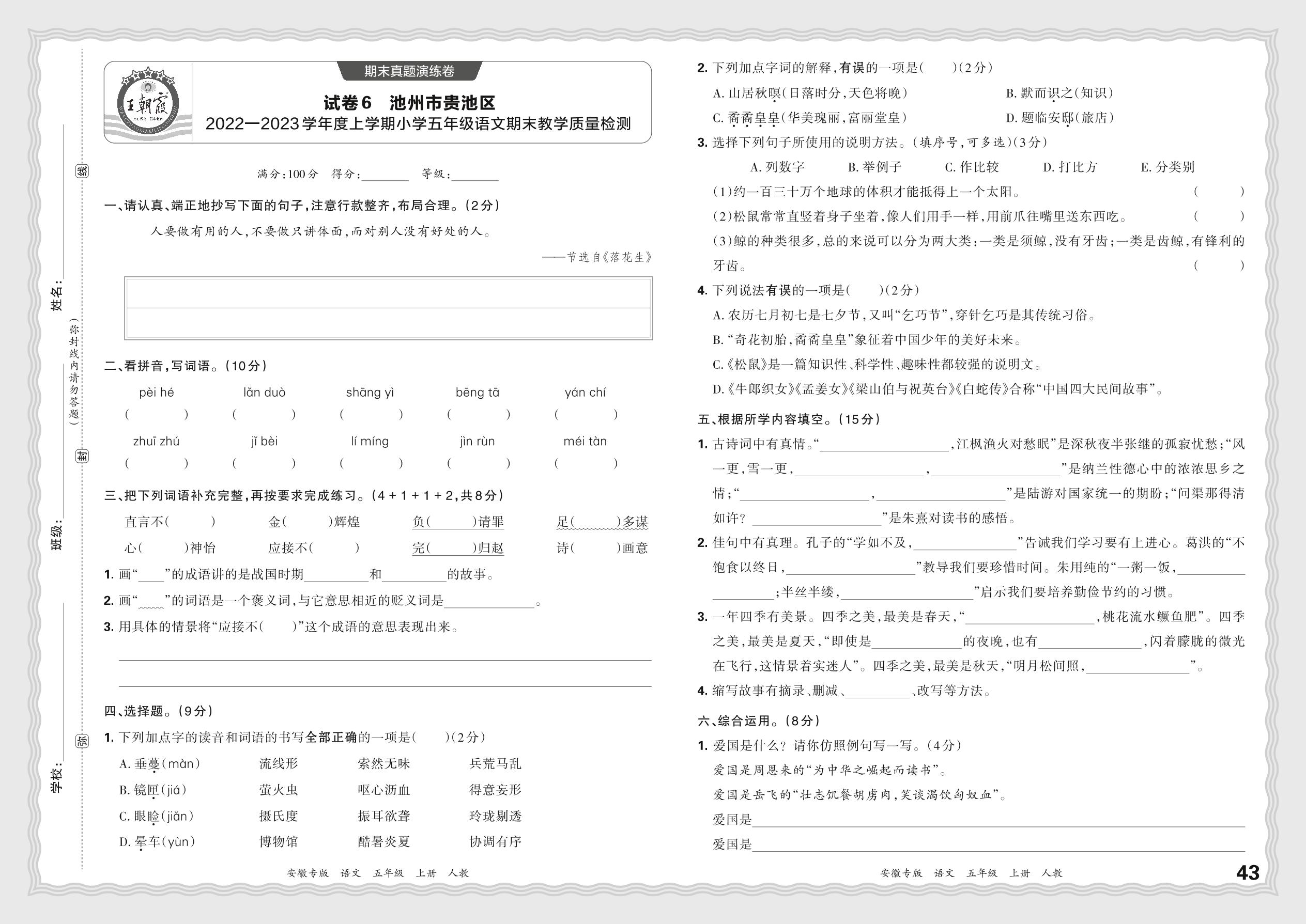 安徽省池州市贵池区2022—2023学年度上学期小学五年级语文期末教学质量检测(人教版)【6】