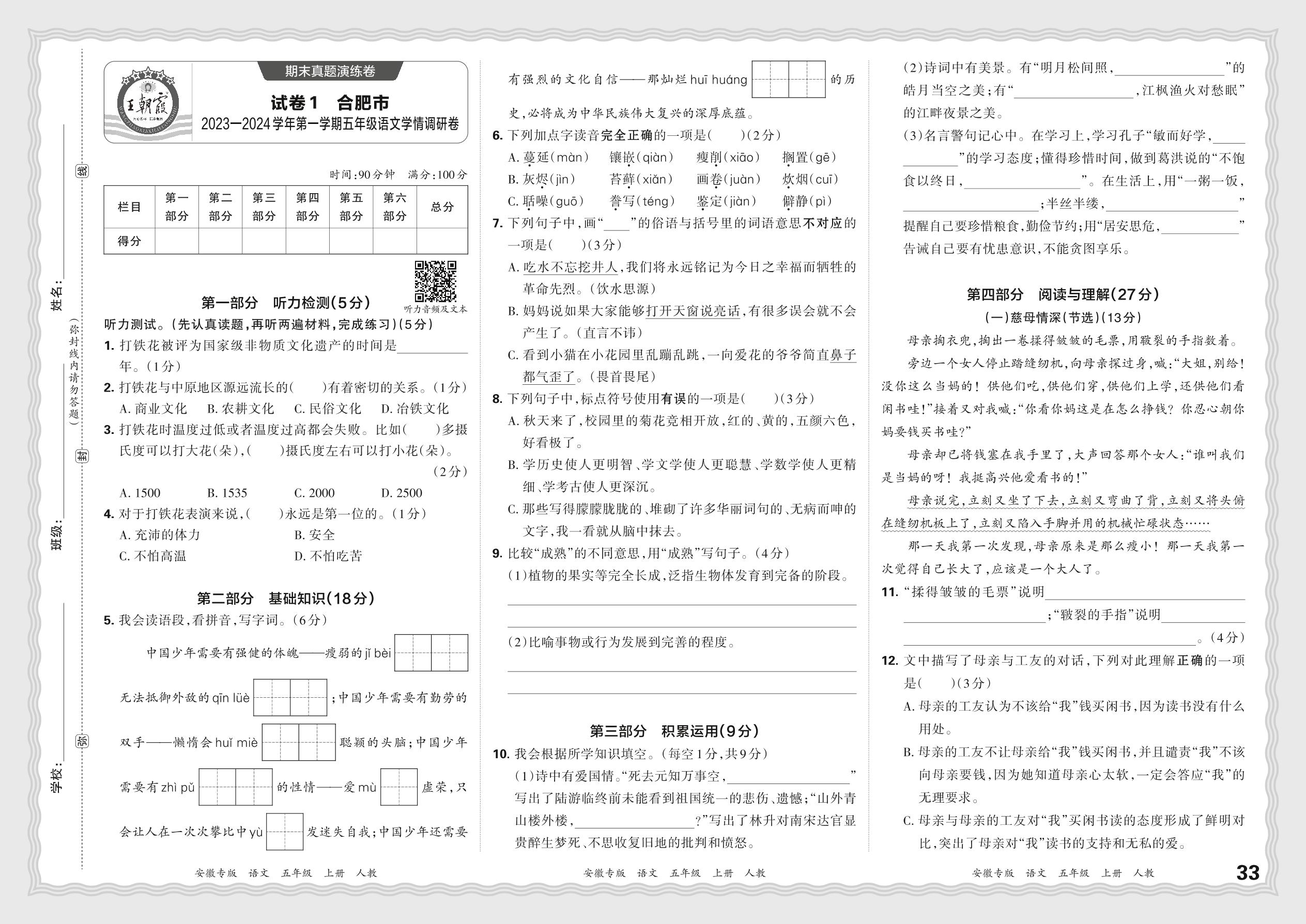 安徽省合肥市2023—2024学年第一学期五年级语文学情调研卷(人教版)【1】