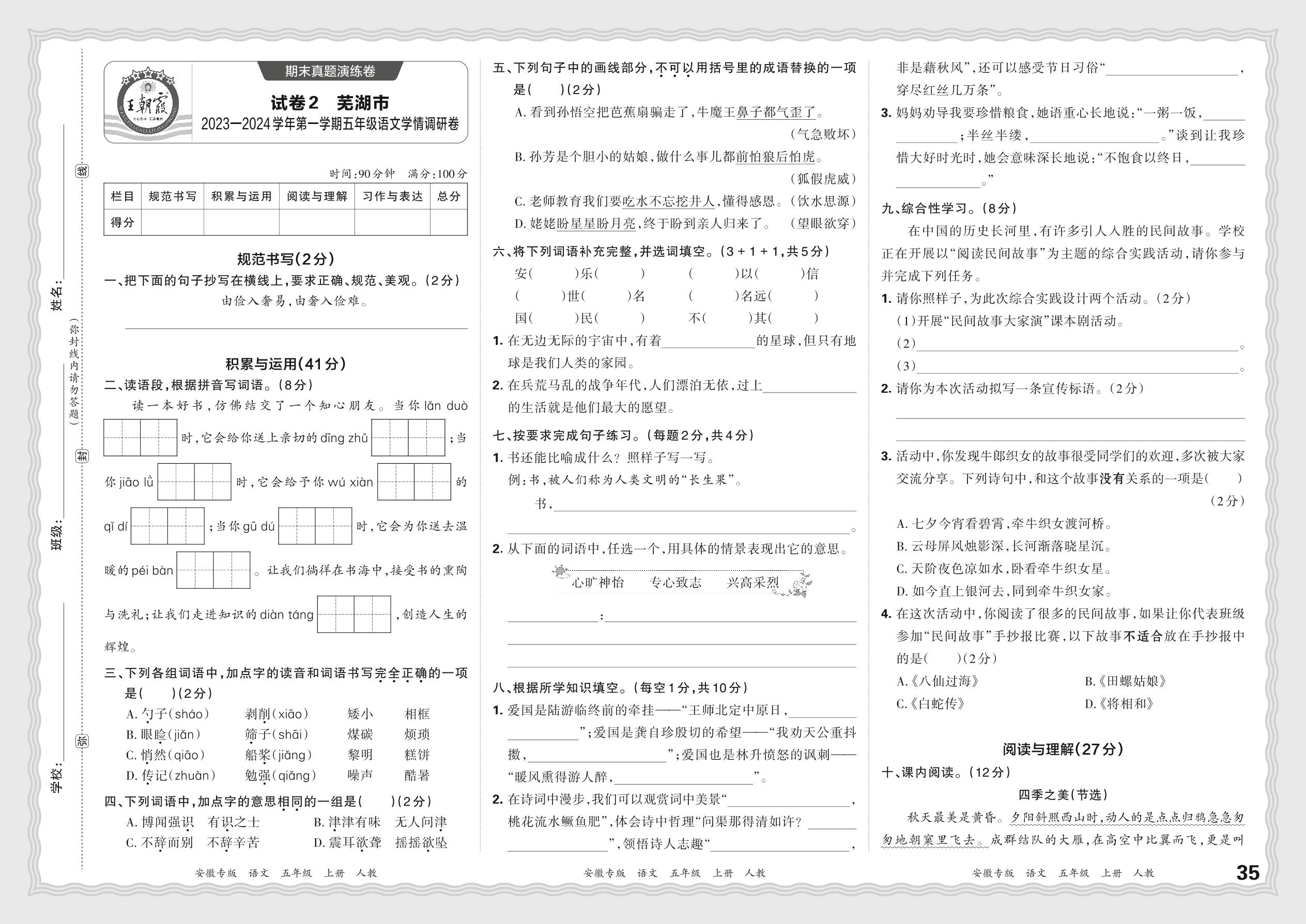 安徽省芜湖市2023—2024学年第一学期五年级语文学情调研卷(人教版)【2】
