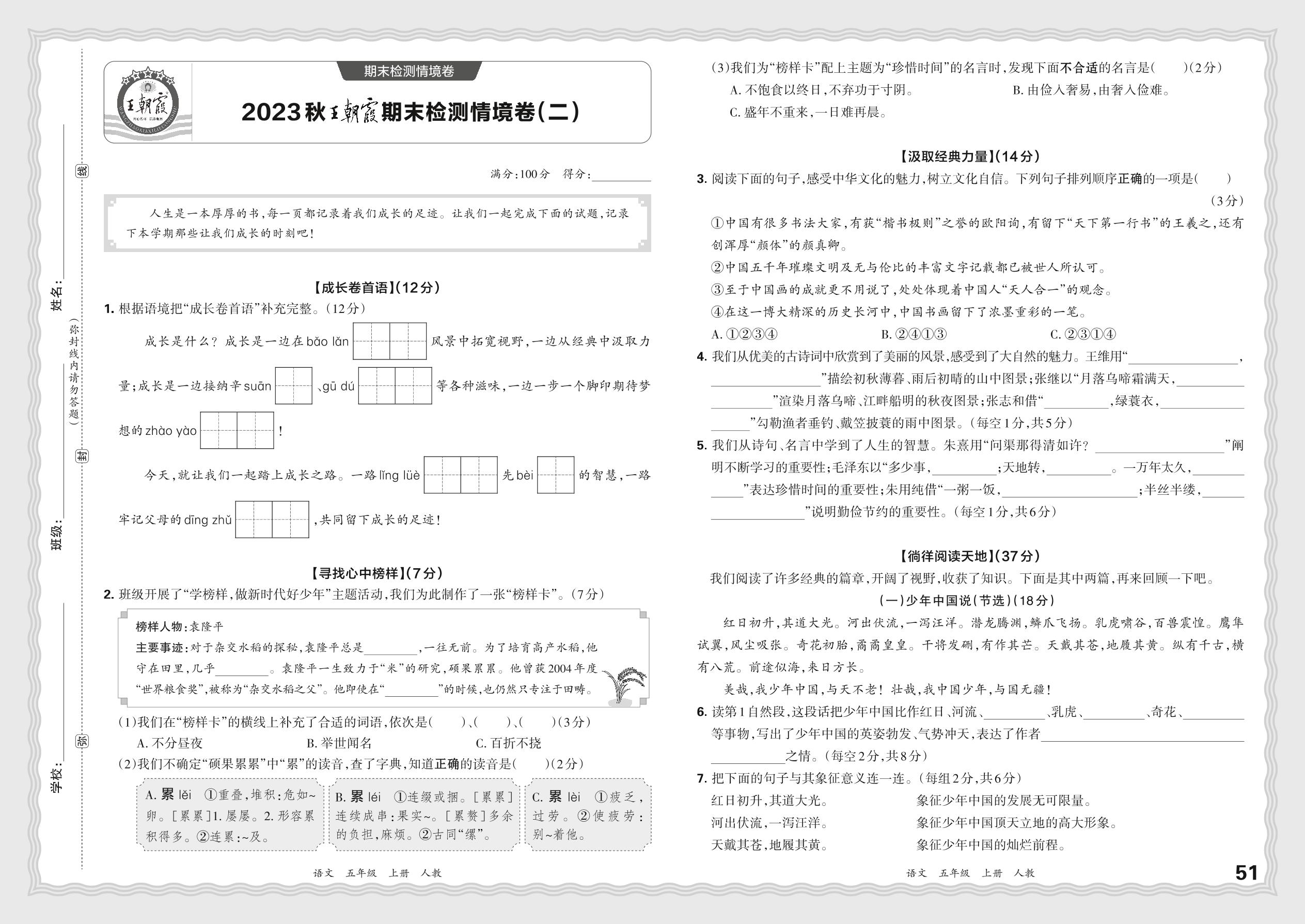 2023秋上册五年级语文人教版 王朝霞期末检测情境卷(二)