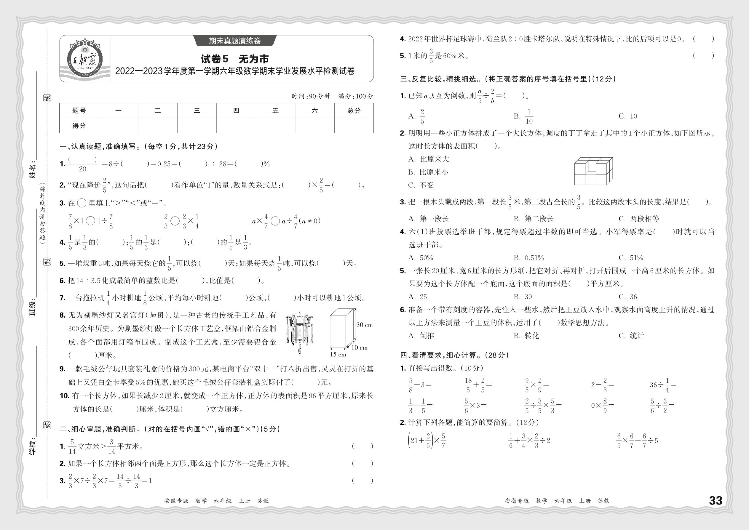 安徽省芜湖市无为市2022—2023学年度第一学期六年级数学期末学业发展水平检测试卷(苏教版)【5】