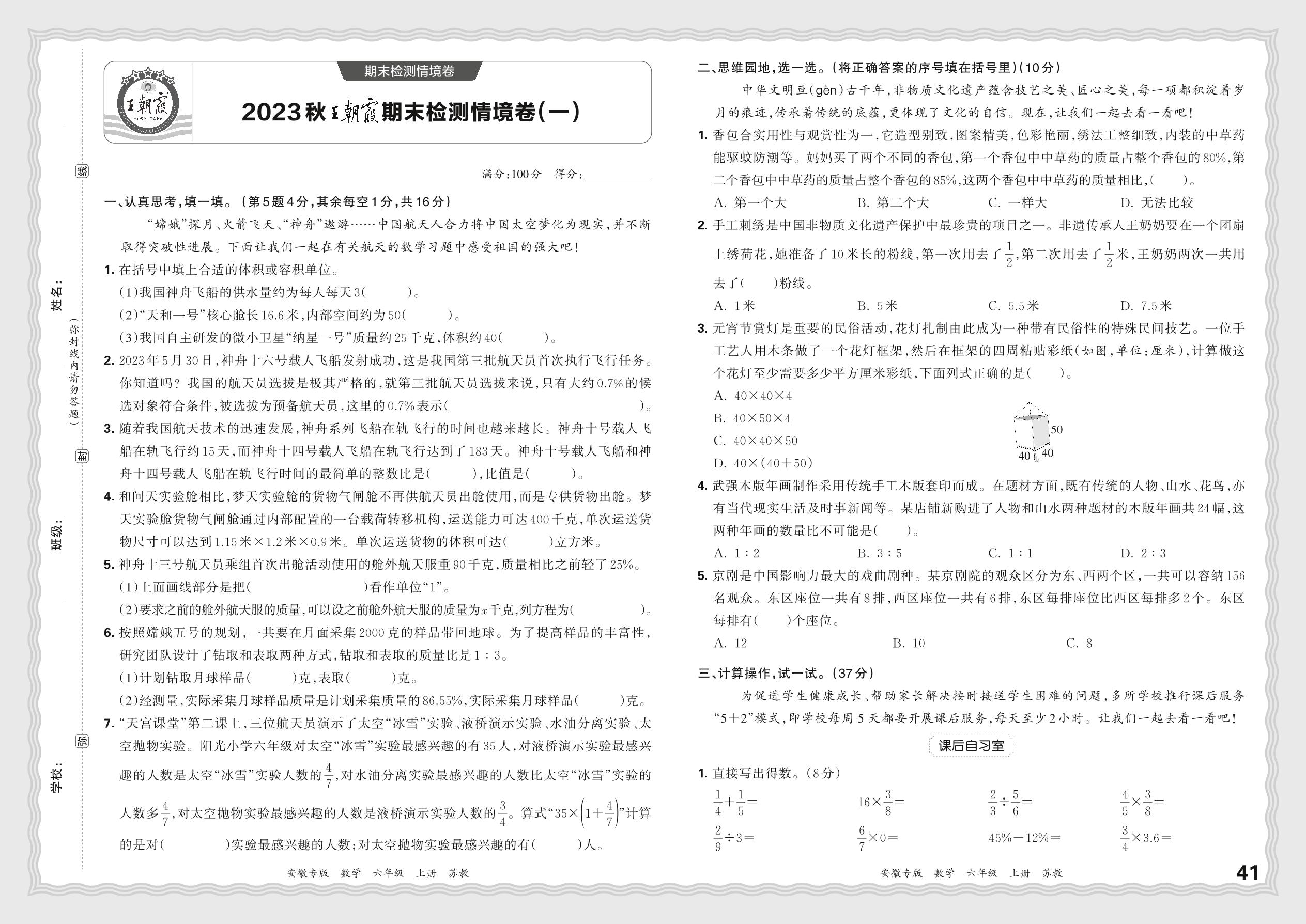 2023秋上册六年级数学苏教版 王朝霞期末检测情境卷(一)