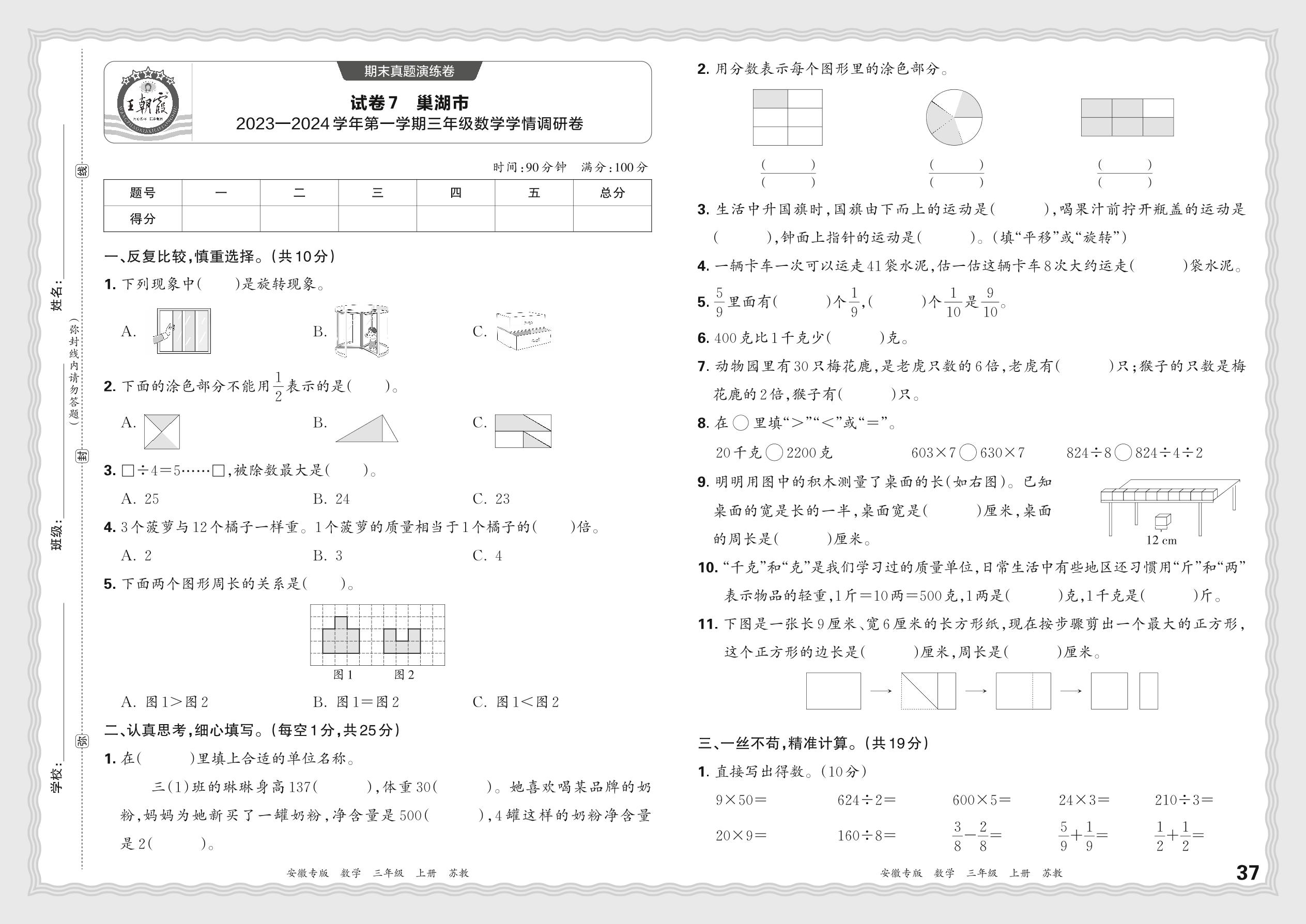 安徽省合肥市巢湖市2023—2024学年第一学期三年级数学学情调研卷(苏教版)【7】