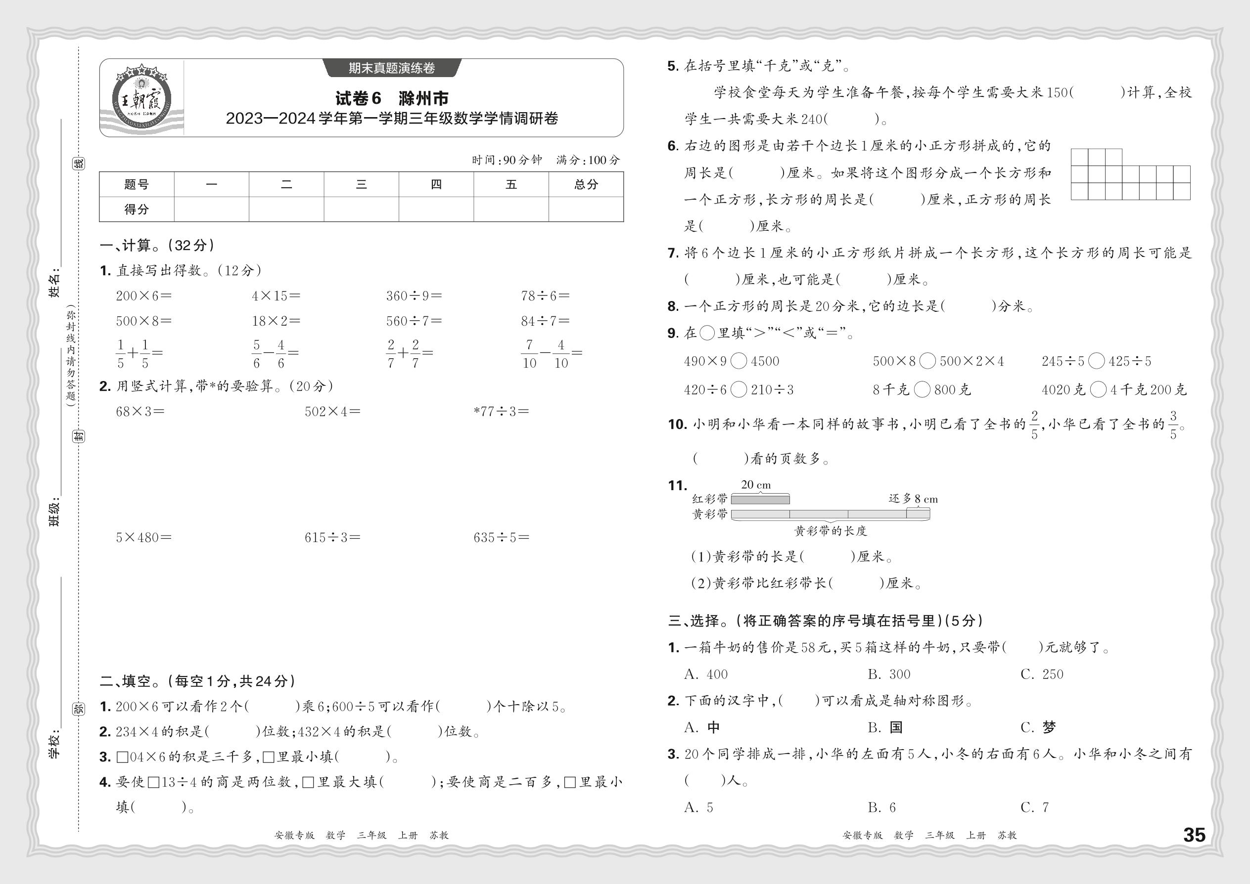安徽省滁州市2023—2024学年第一学期三年级数学学情调研卷(苏教版)【6】