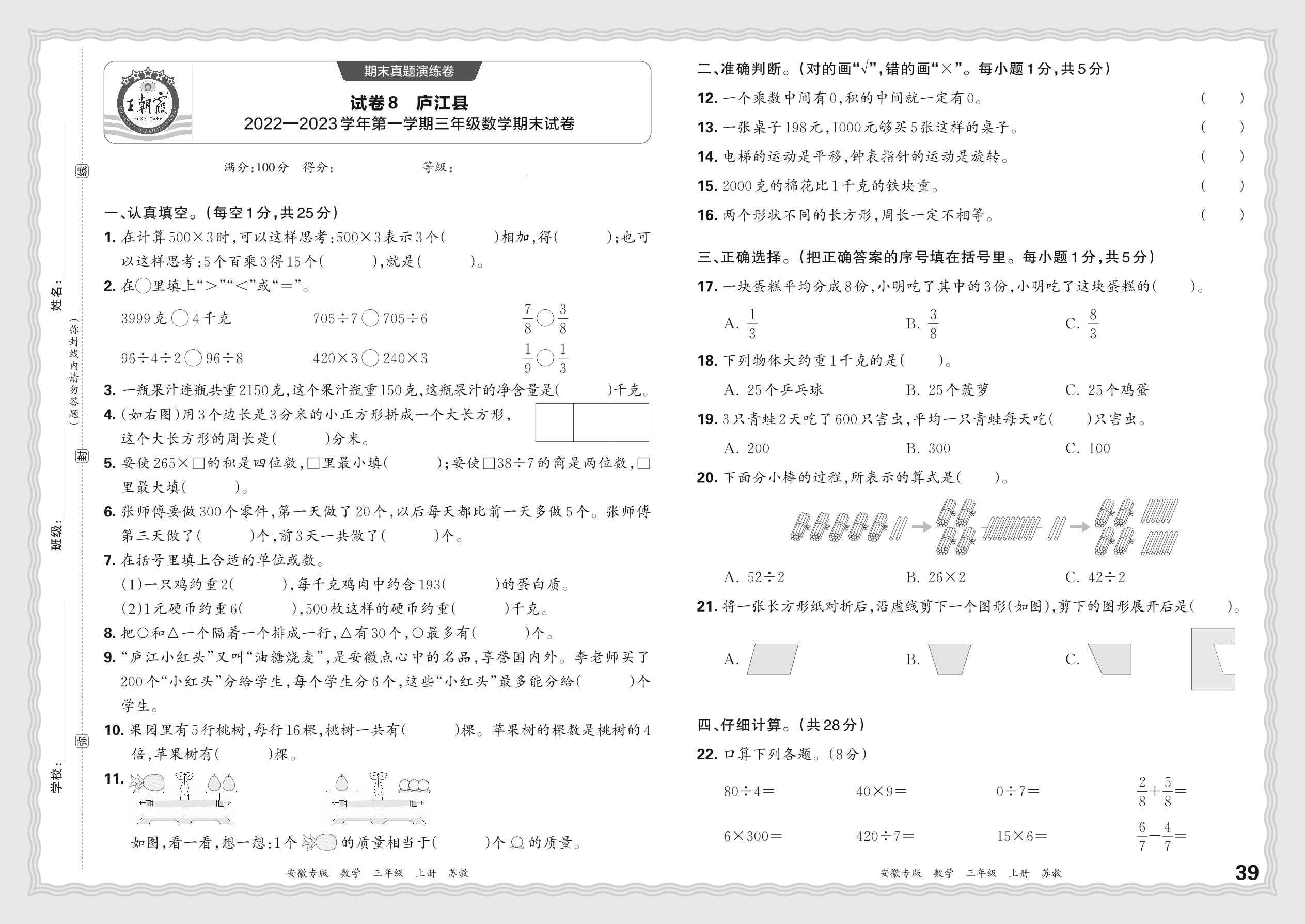 安徽省合肥市庐江县2022—2023学年第一学期三年级数学期末试卷(苏教版)【8】