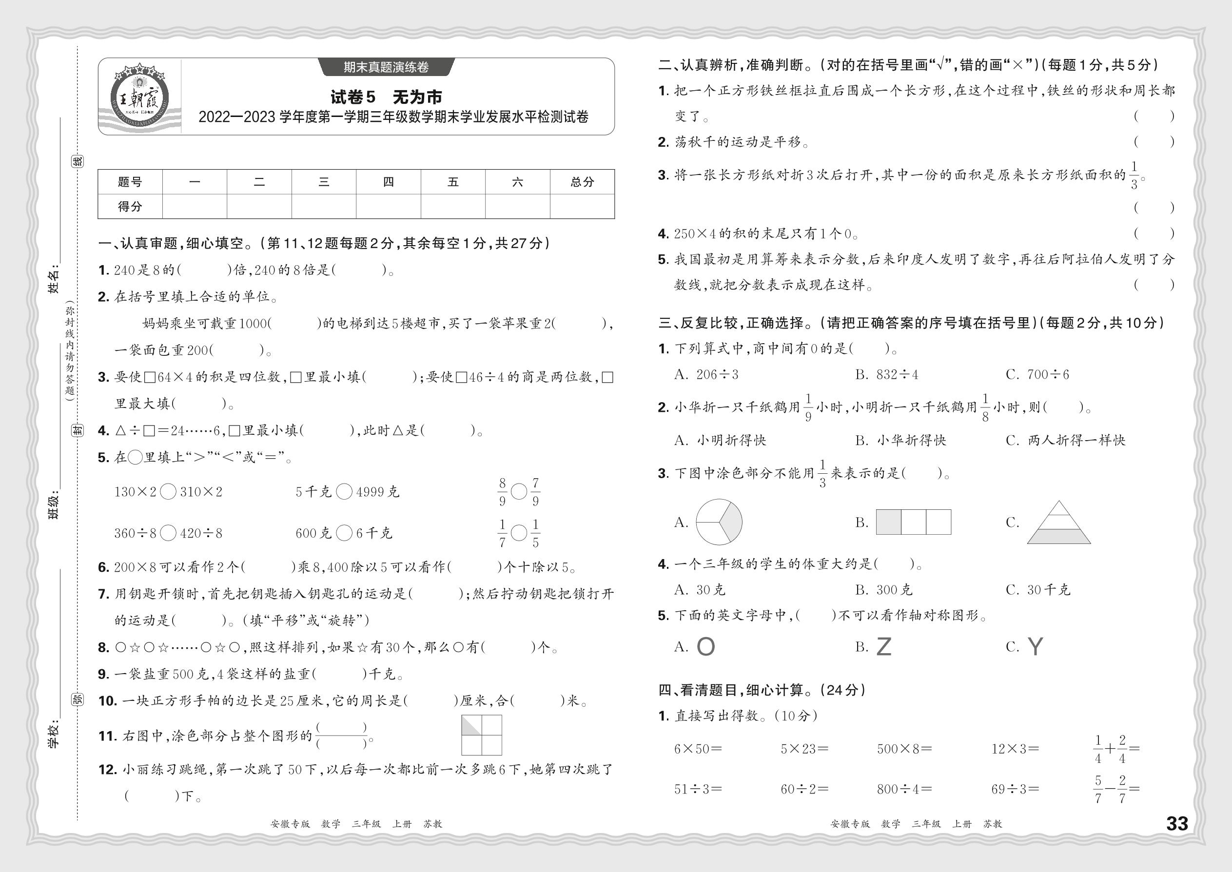安徽省芜湖市无为市2022—2023学年度第一学期三年级数学期末学业发展水平检测试卷(苏教版)【5】