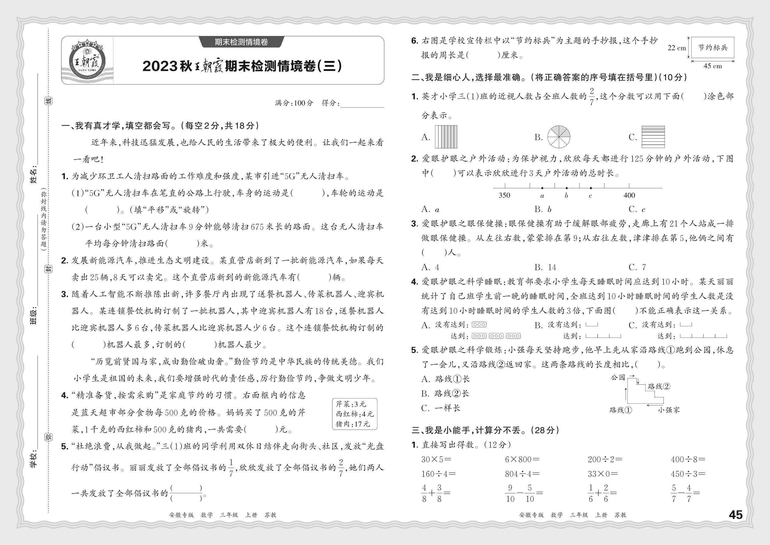 2023秋上册三年级数学苏教版 王朝霞期末检测情境卷(三)