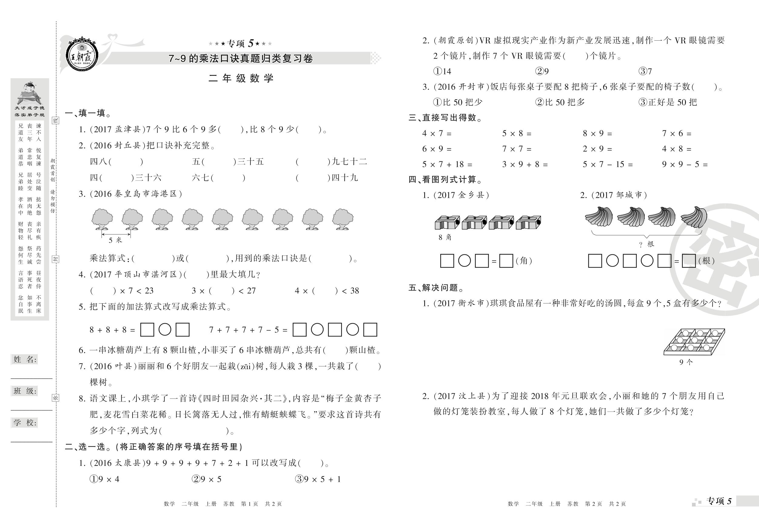 王朝霞期末专项卷——7~9的乘法口诀、用7~9的乘法口诀计算除法真题归类复习卷二年级上册数学(苏教版)_R210803103853【0】