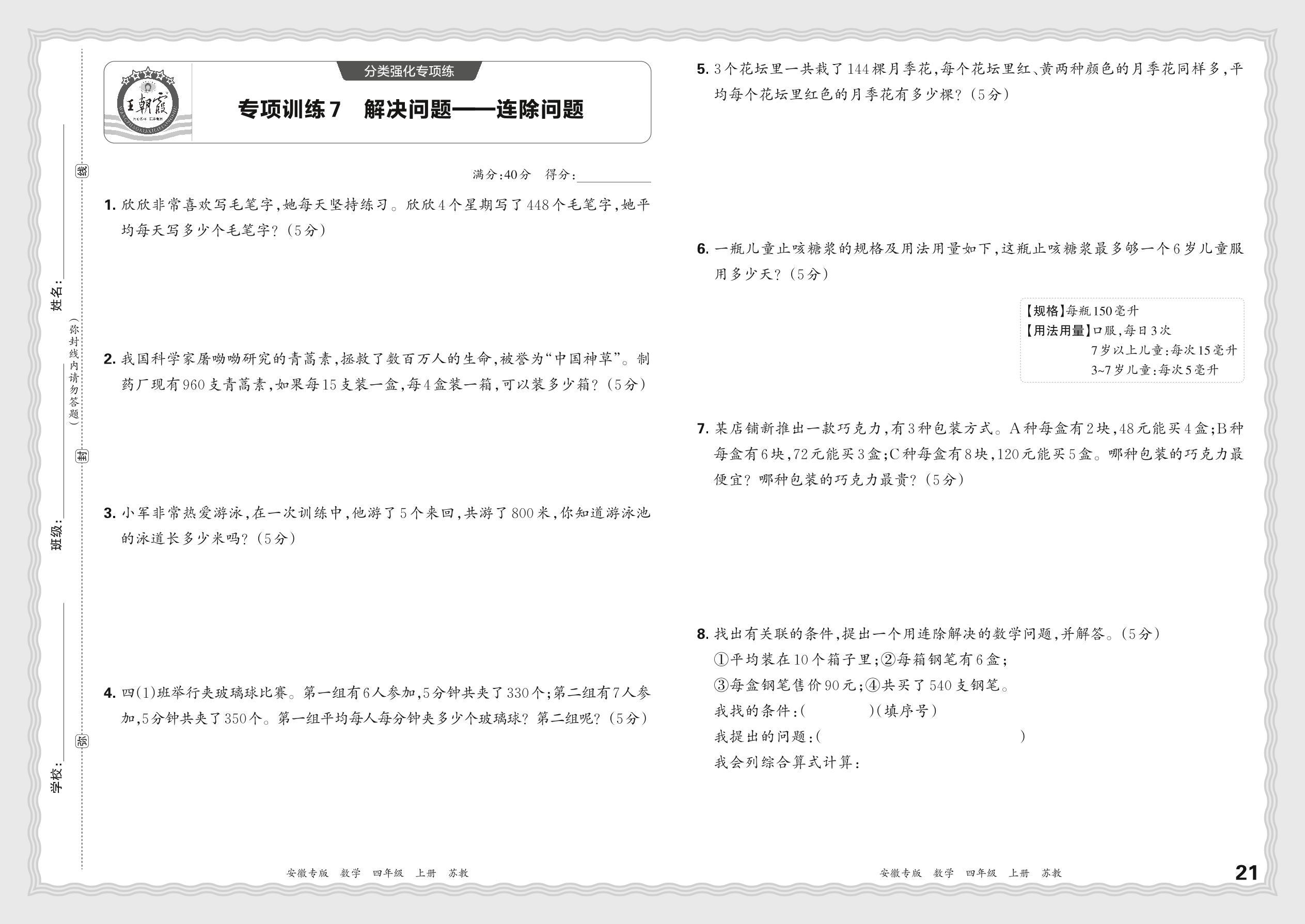 2023秋上册四年级数学苏教版 期末专项·解决问题——连除问题【7】