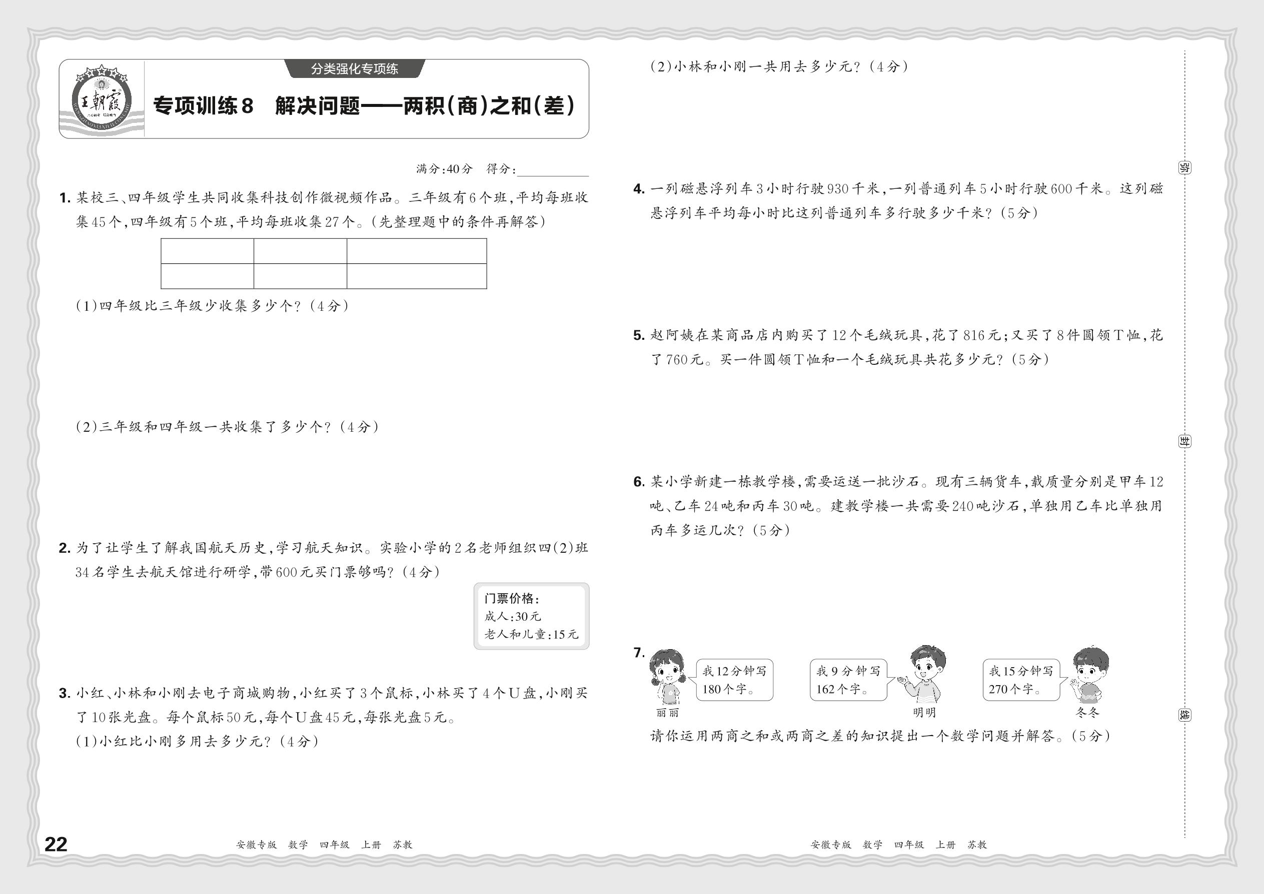 2023秋上册四年级数学苏教版 期末专项·解决问题——两积(商)之和(差)【8】