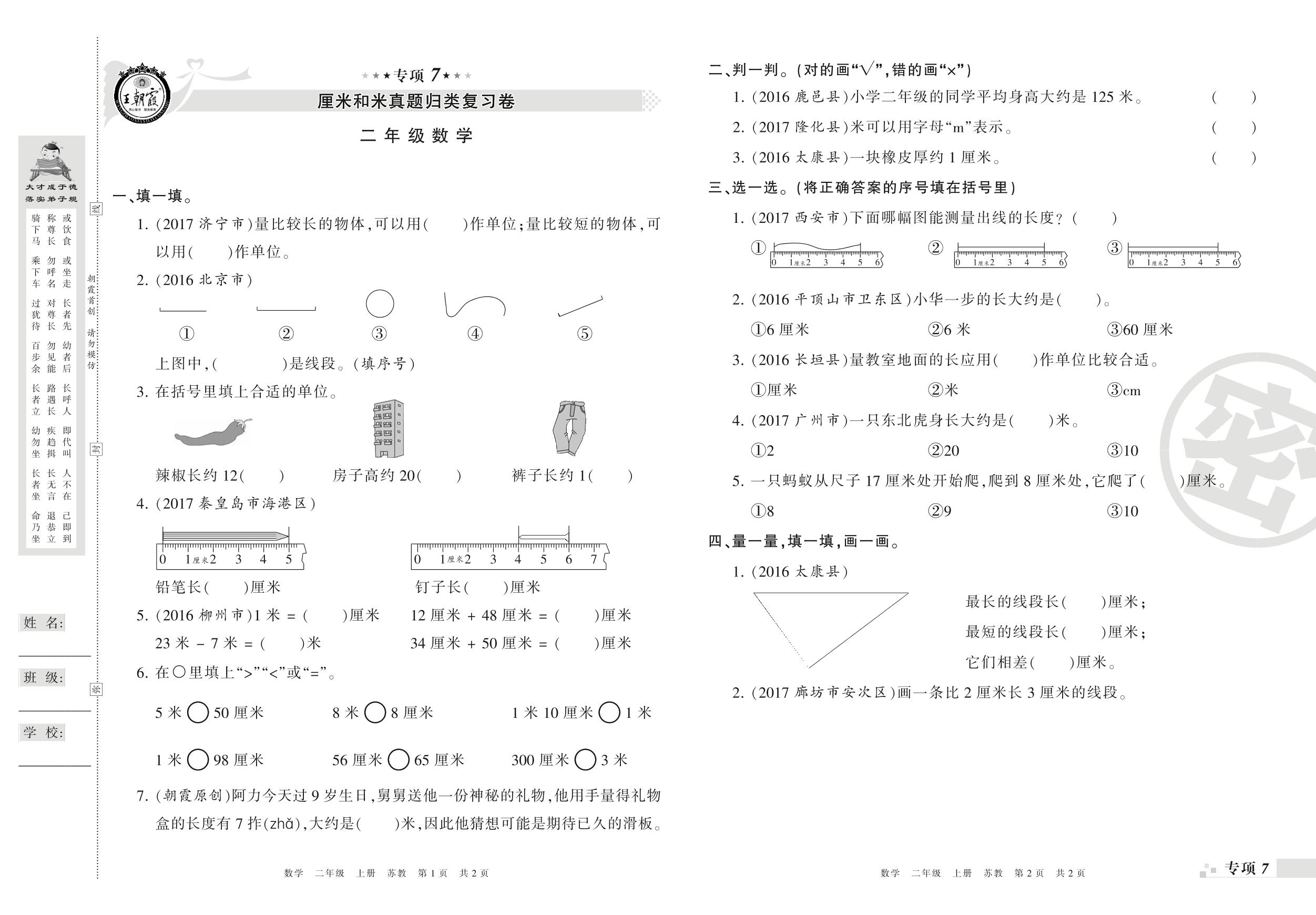 王朝霞期末专项卷——厘米和米、平行四边形的初步认识及观察物体真题归类复习卷二年级上册数学(苏教版)_R210803103855【0】