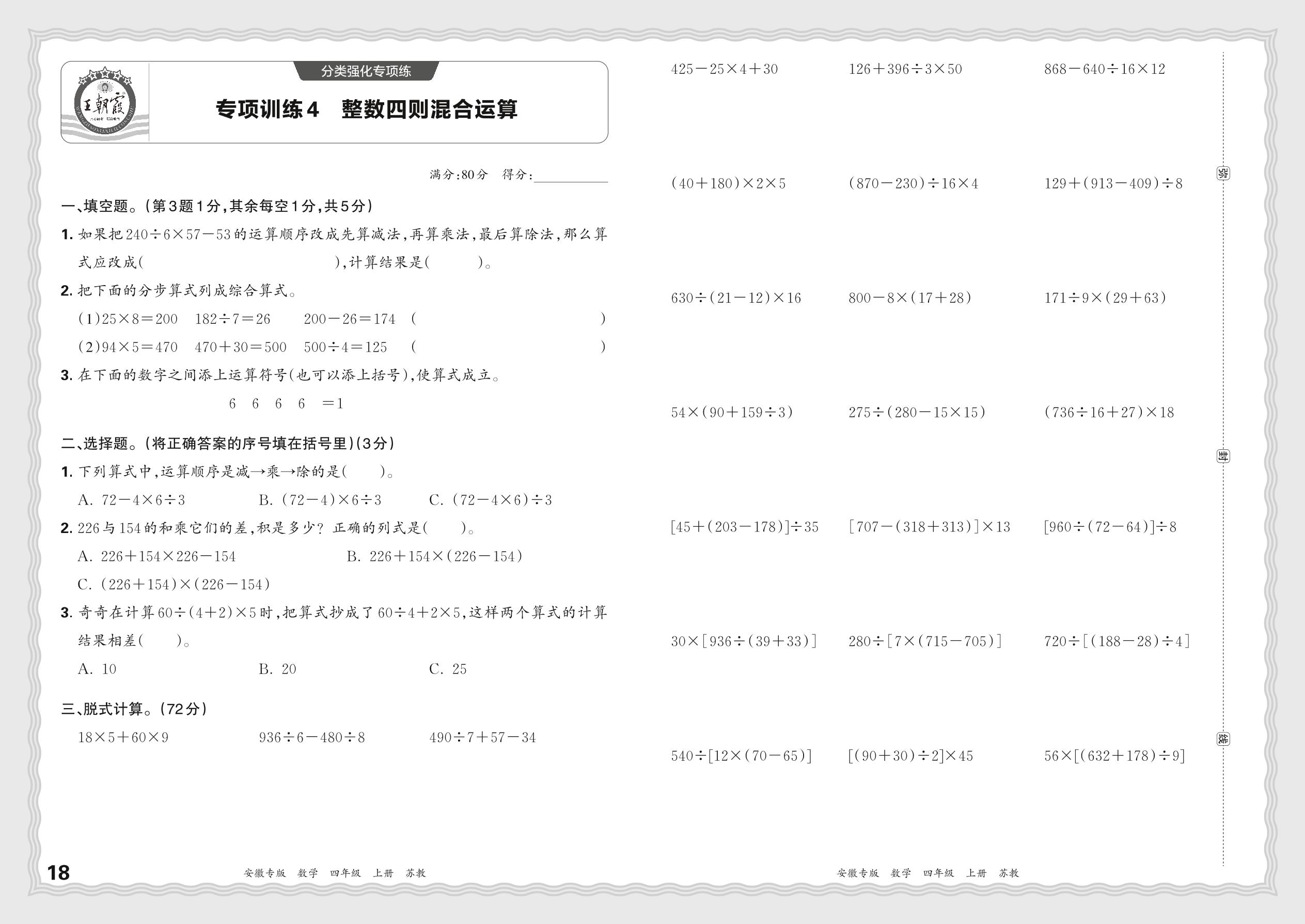 2023秋上册四年级数学苏教版 期末专项·整数四则混合运算【4】