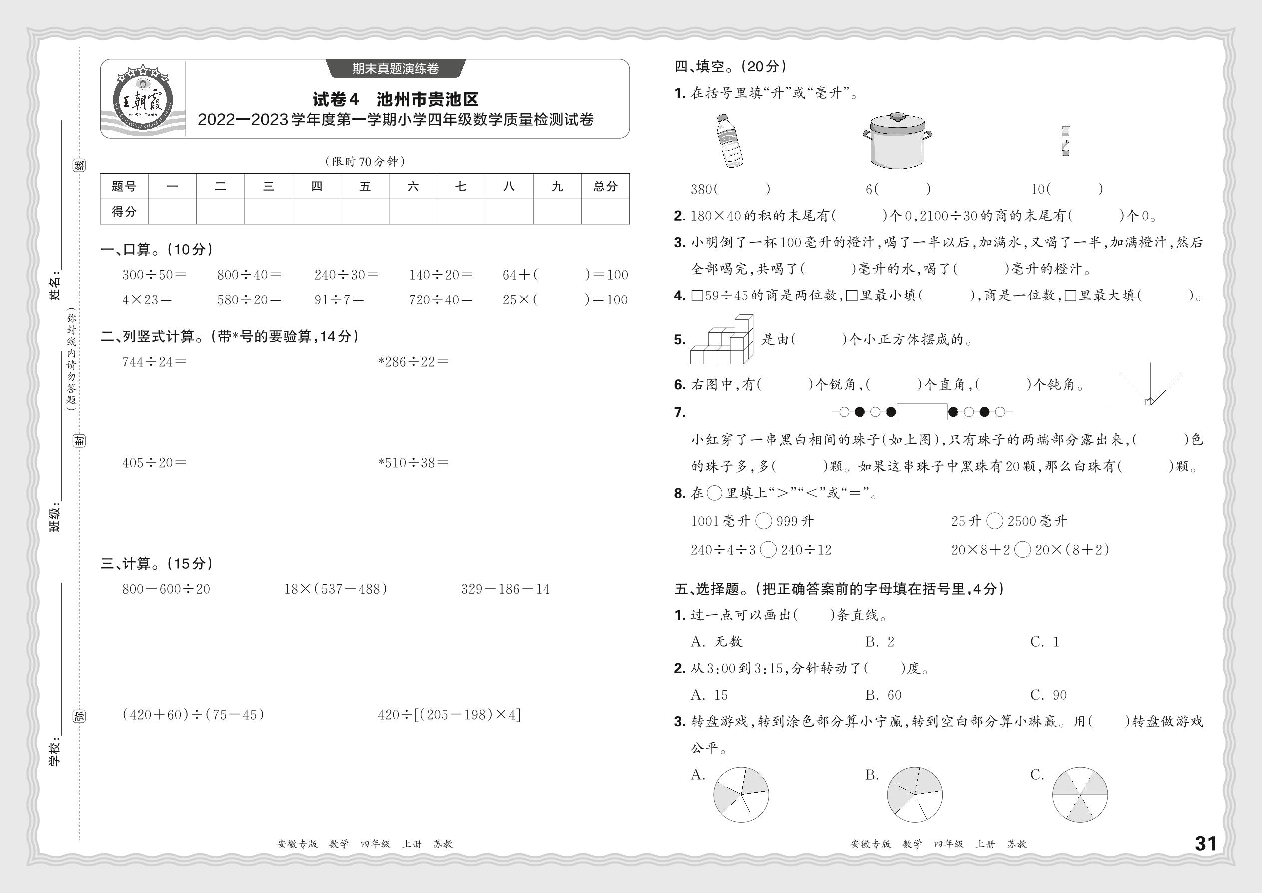 四年级数学苏教版上册期末卷