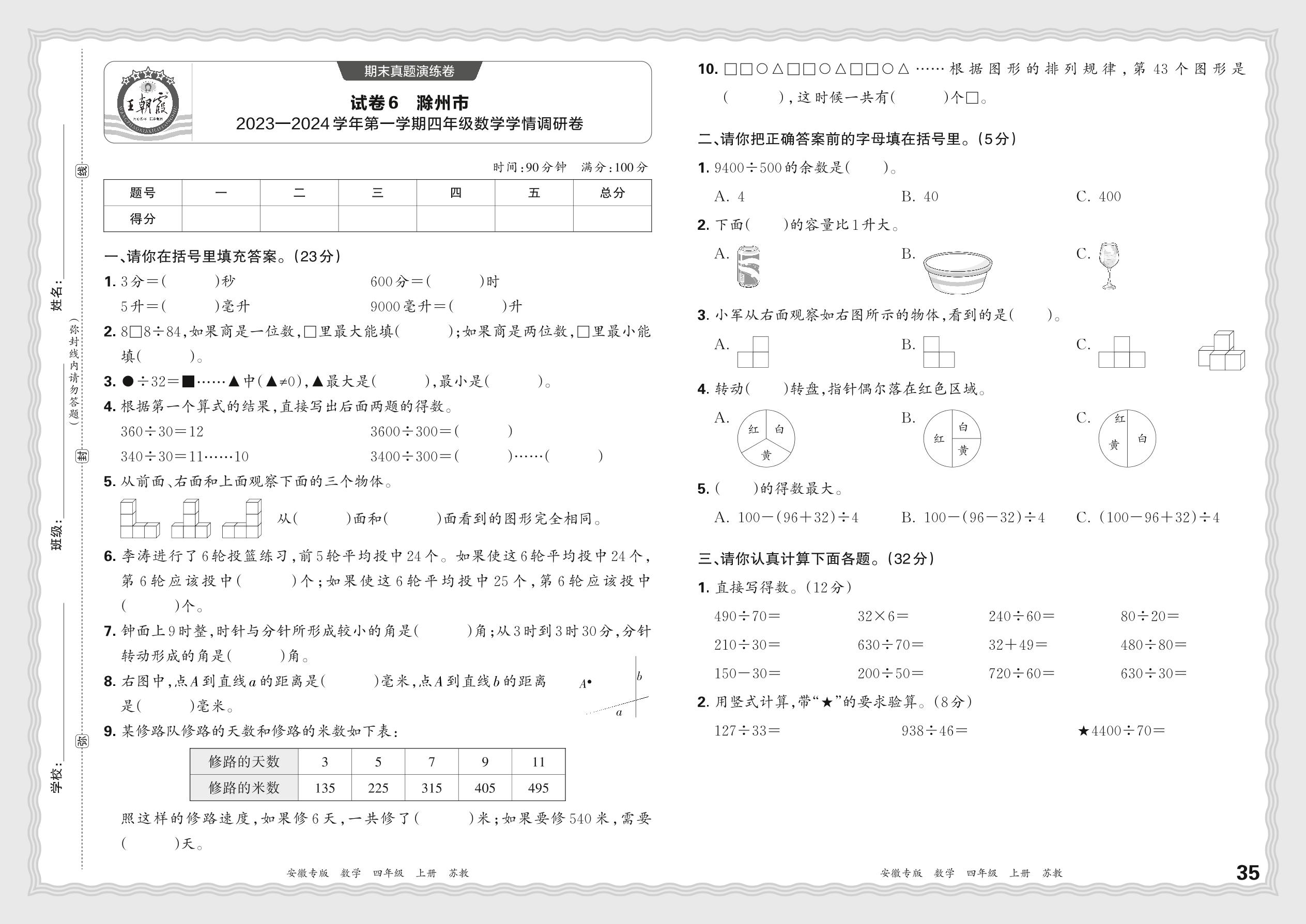 安徽省滁州市2023—2024学年第一学期四年级数学学情调研卷(苏教版)【6】