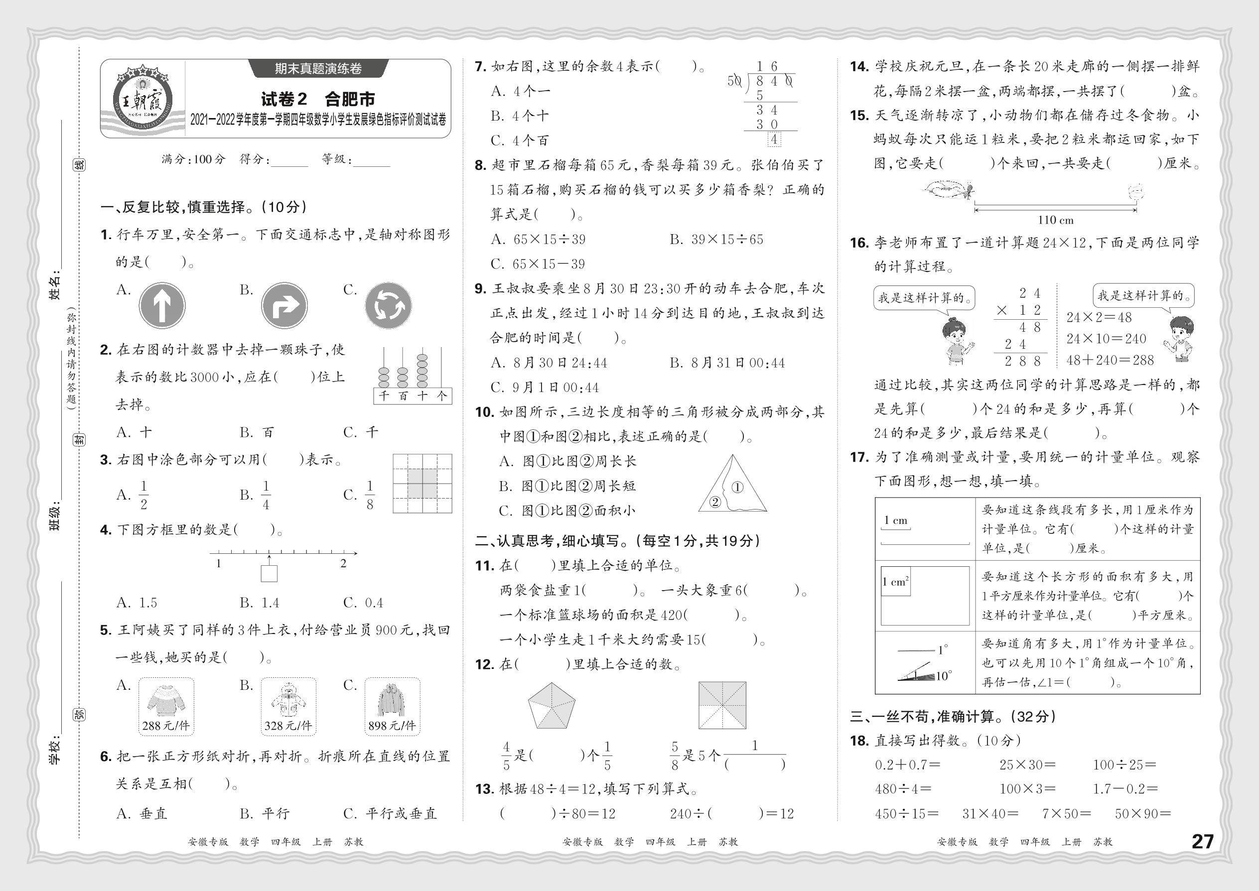 安徽省合肥市2021—2022学年度第一学期四年级数学小学生发展绿色指标评价测试试题卷(苏教版)【2】