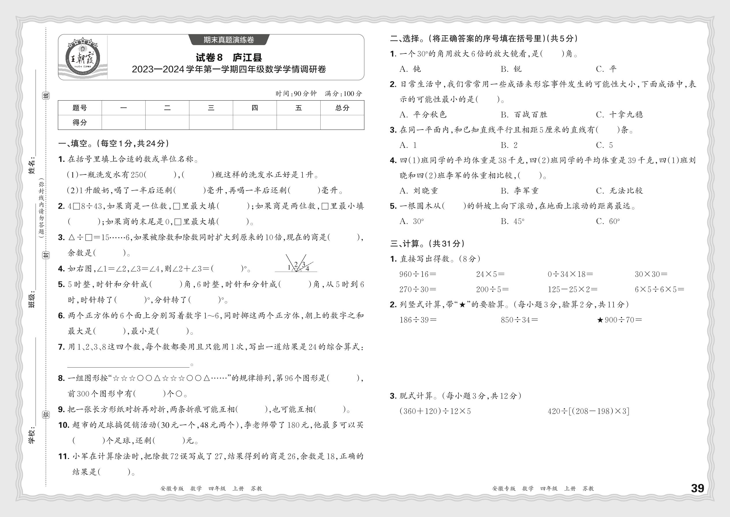 安徽省合肥市庐江县2023—2024学年第一学期四年级数学学情调研卷(苏教版)【8】