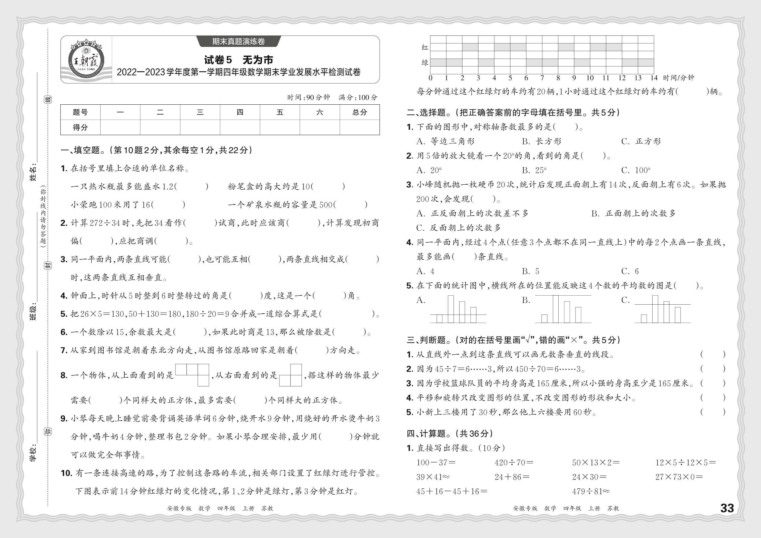 安徽省芜湖市无为市2022—2023学年度第一学期四年级数学期末学业发展水平检测试卷(苏教版)【5】