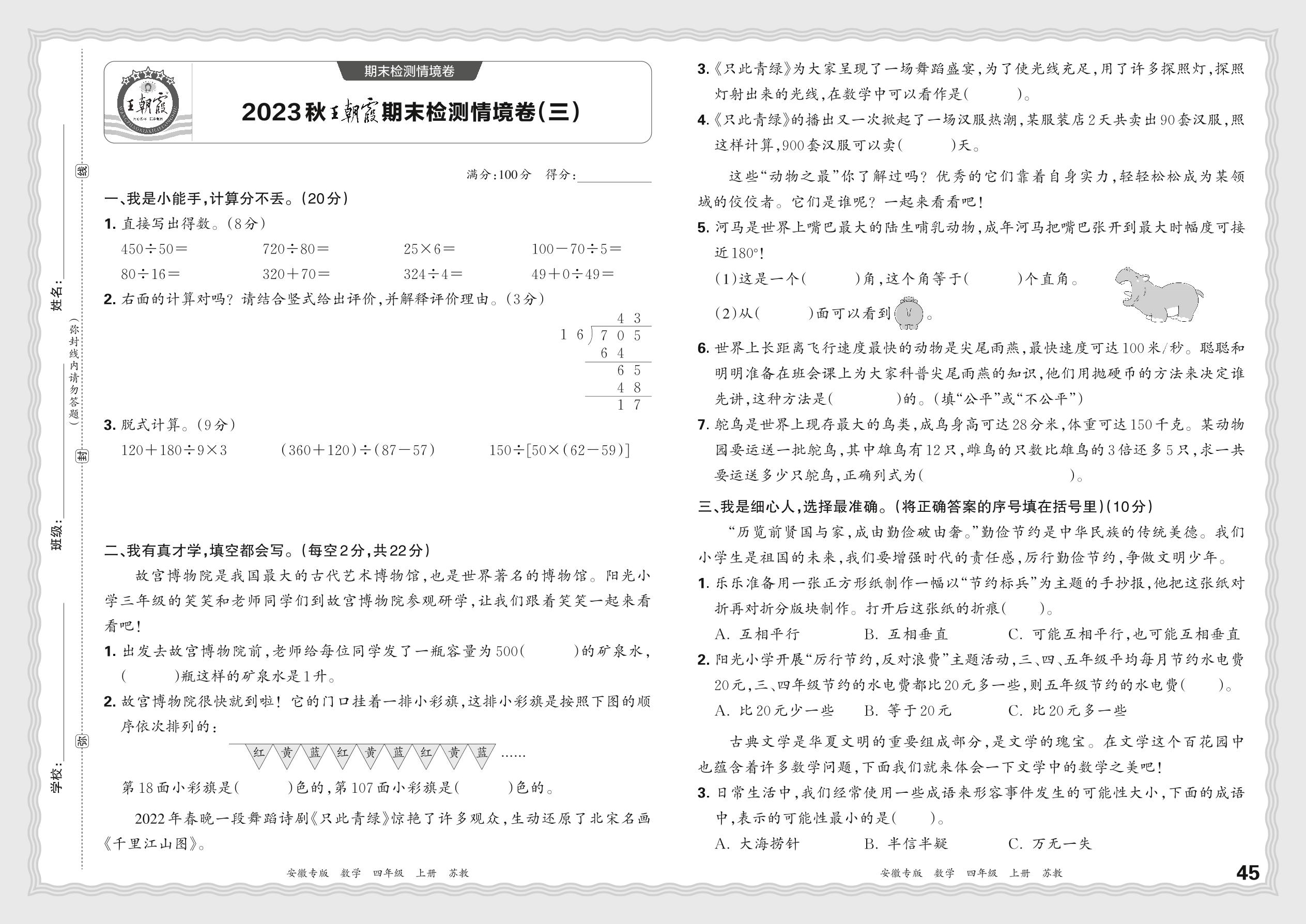 2023秋上册四年级数学苏教版 王朝霞期末检测情境卷(三)