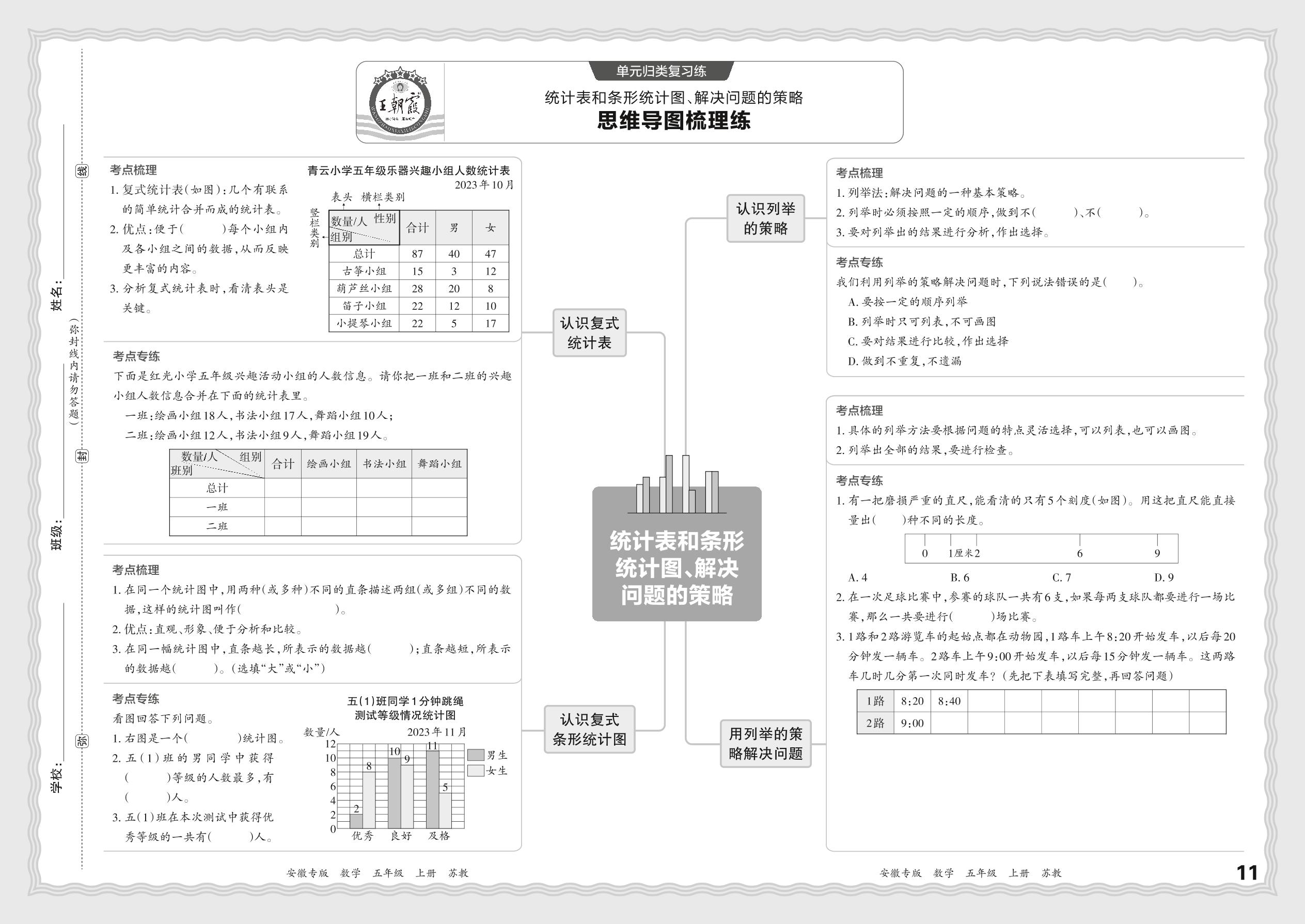 2023秋上册五年级数学苏教版 期末过课本·单元归类复习练——统计表和条形统计图、解决问题的策略【5】