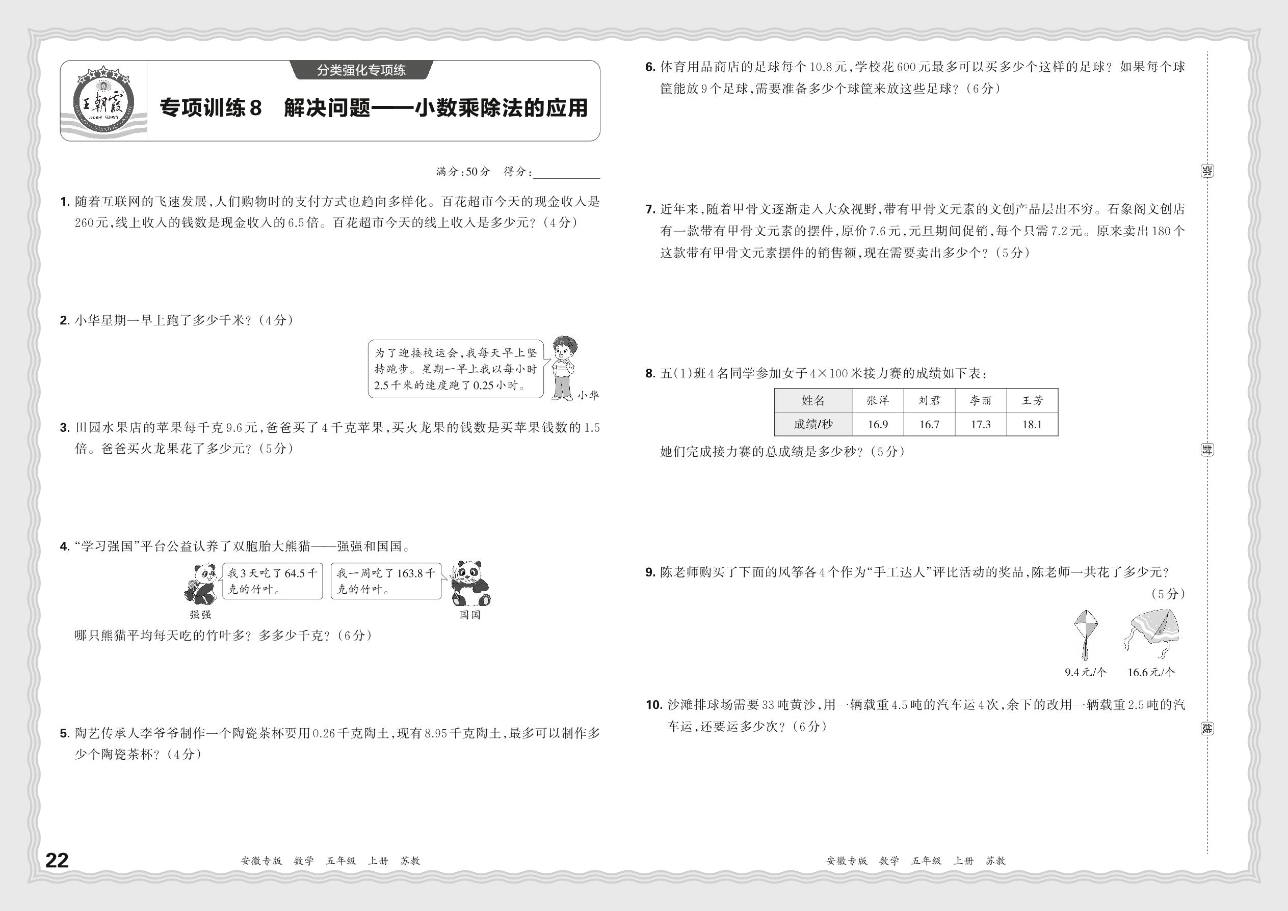 2023秋上册五年级数学苏教版 期末专项·解决问题——小数乘除法的应用【8】