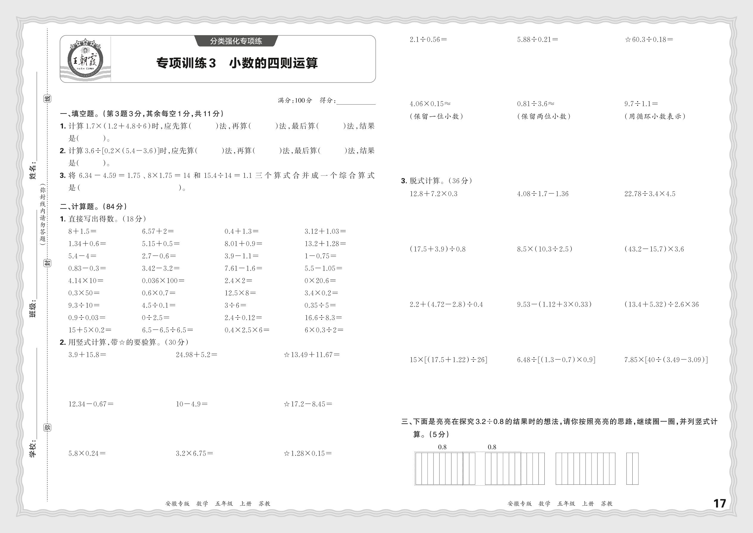 2023秋上册五年级数学苏教版 期末专项·小数的四则运算【3】