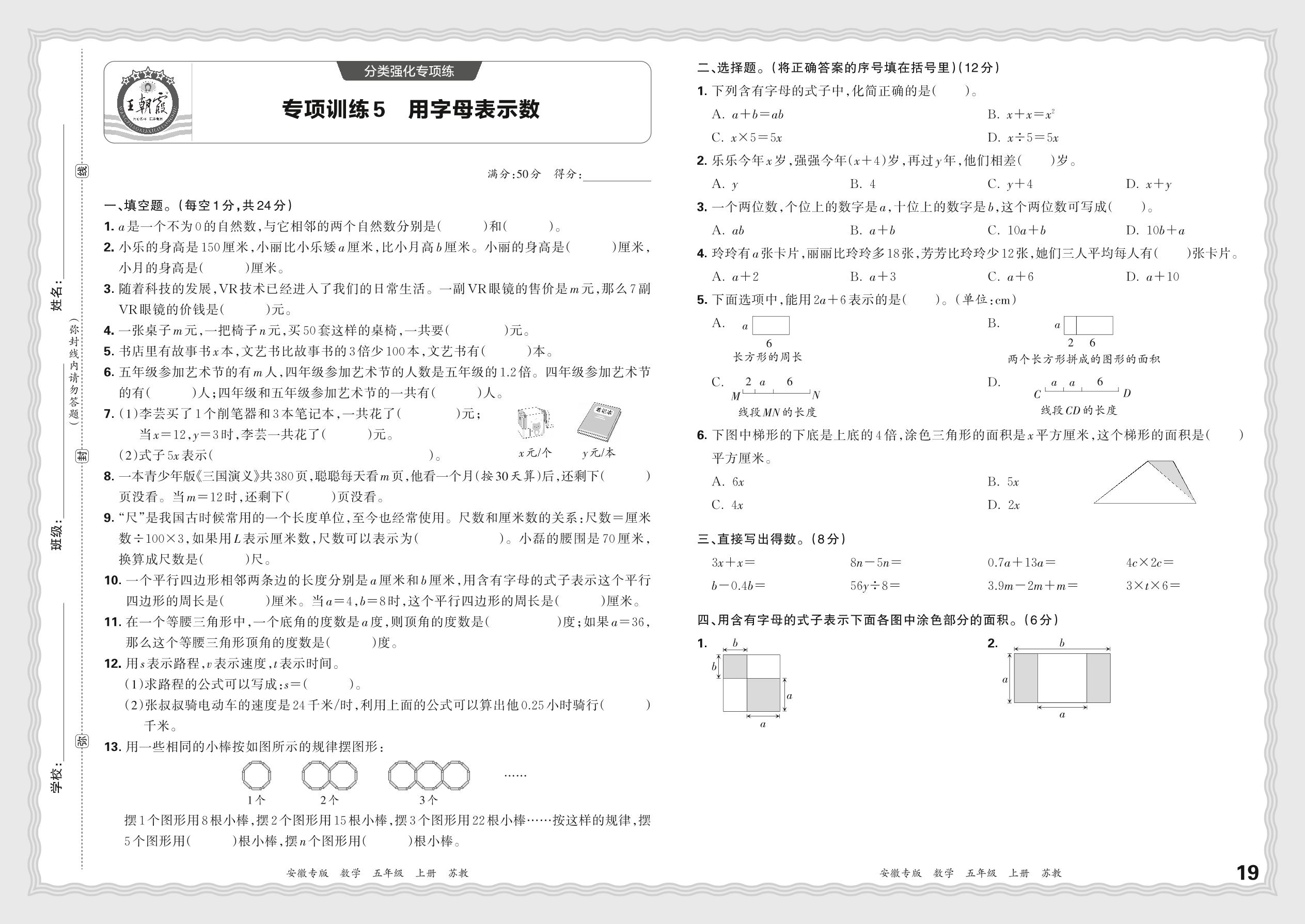 2023秋上册五年级数学苏教版 期末专项·用字母表示数【5】