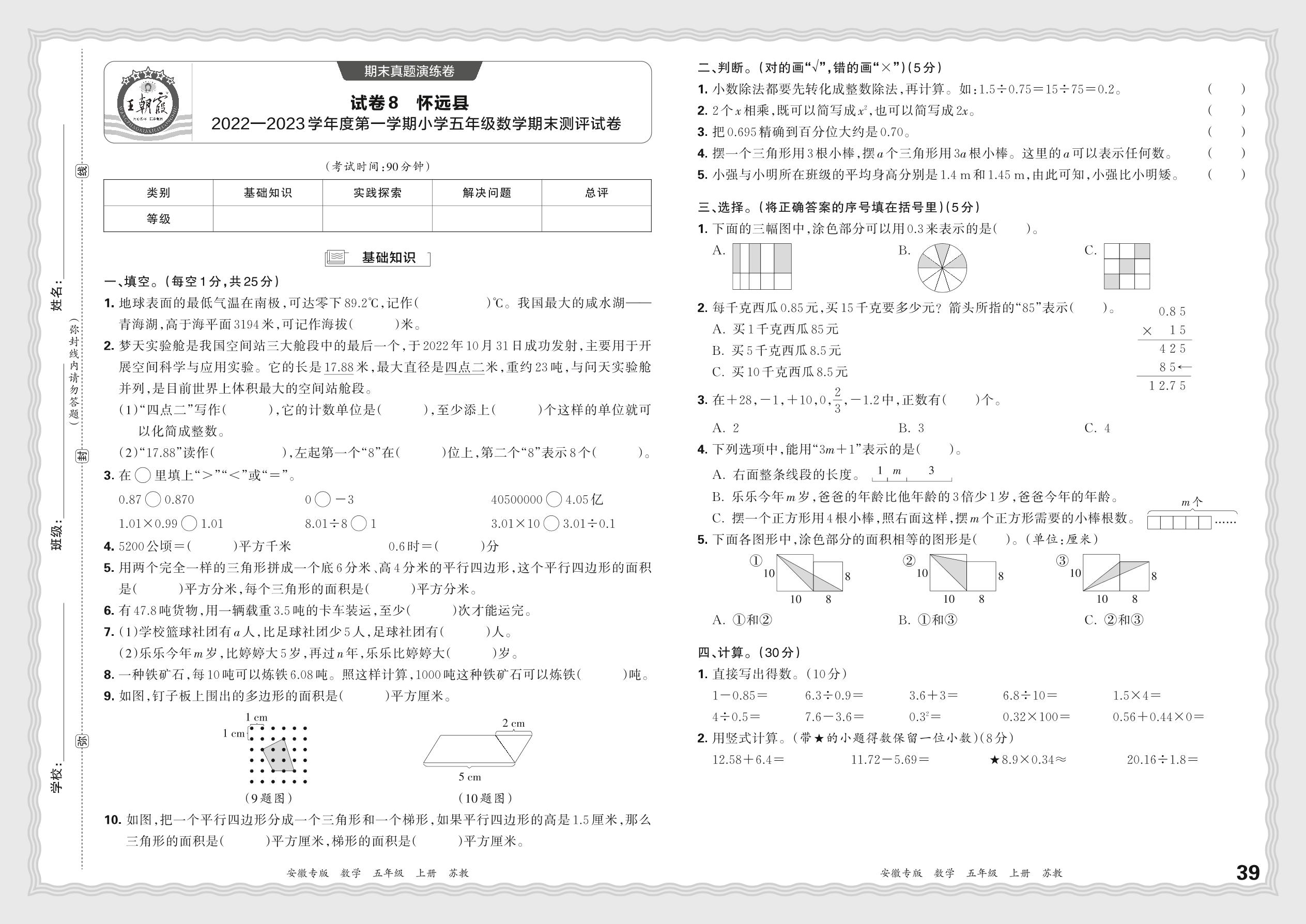 安徽省蚌埠市怀远县2022—2023学年度第一学期小学五年级数学期末测评试卷(苏教版)【8】