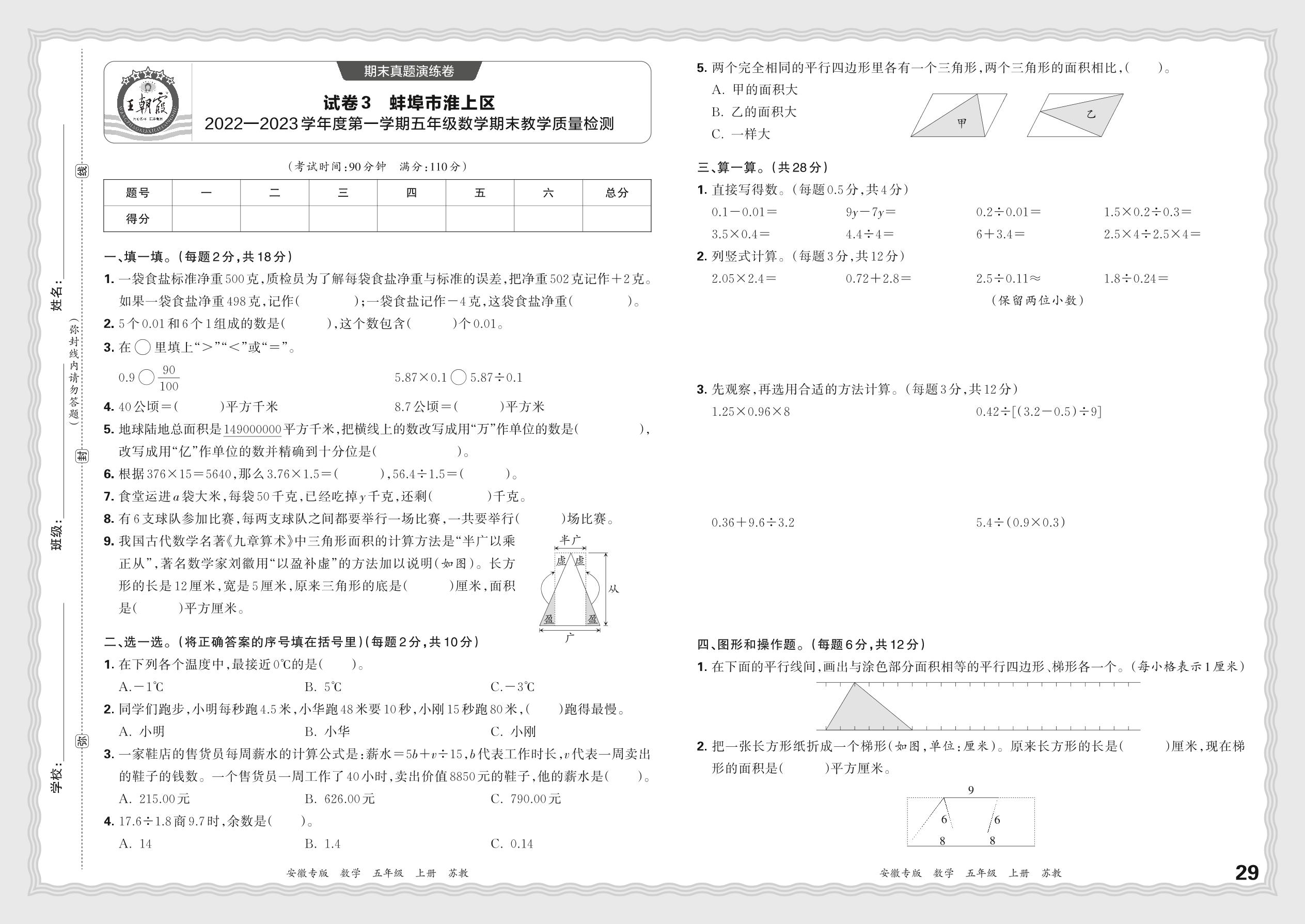 安徽省蚌埠市淮上区2022—2023学年度第一学期五年级数学期末教学质量检测(苏教版)【3】