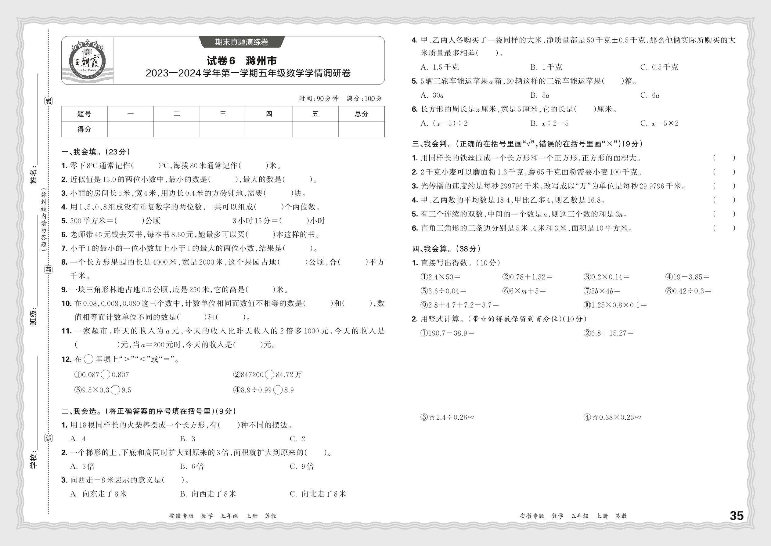 安徽省滁州市2023—2024学年第一学期五年级数学学情调研卷(苏教版)【6】