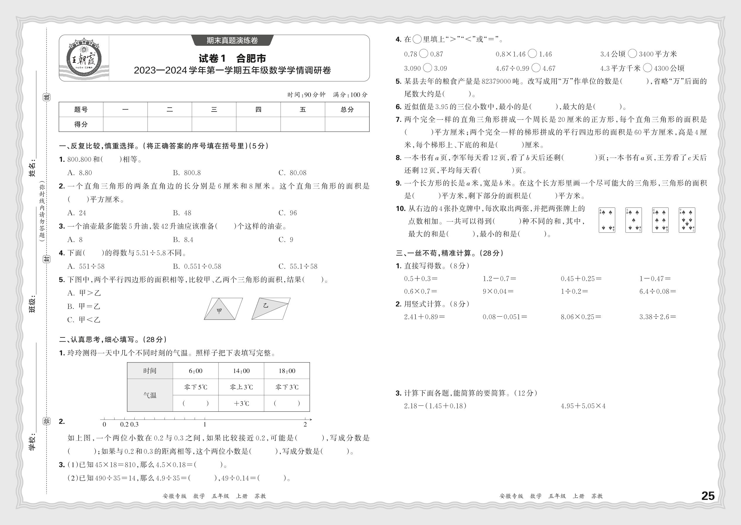安徽省合肥市2023—2024学年第一学期五年级数学学情调研卷(苏教版)【1】