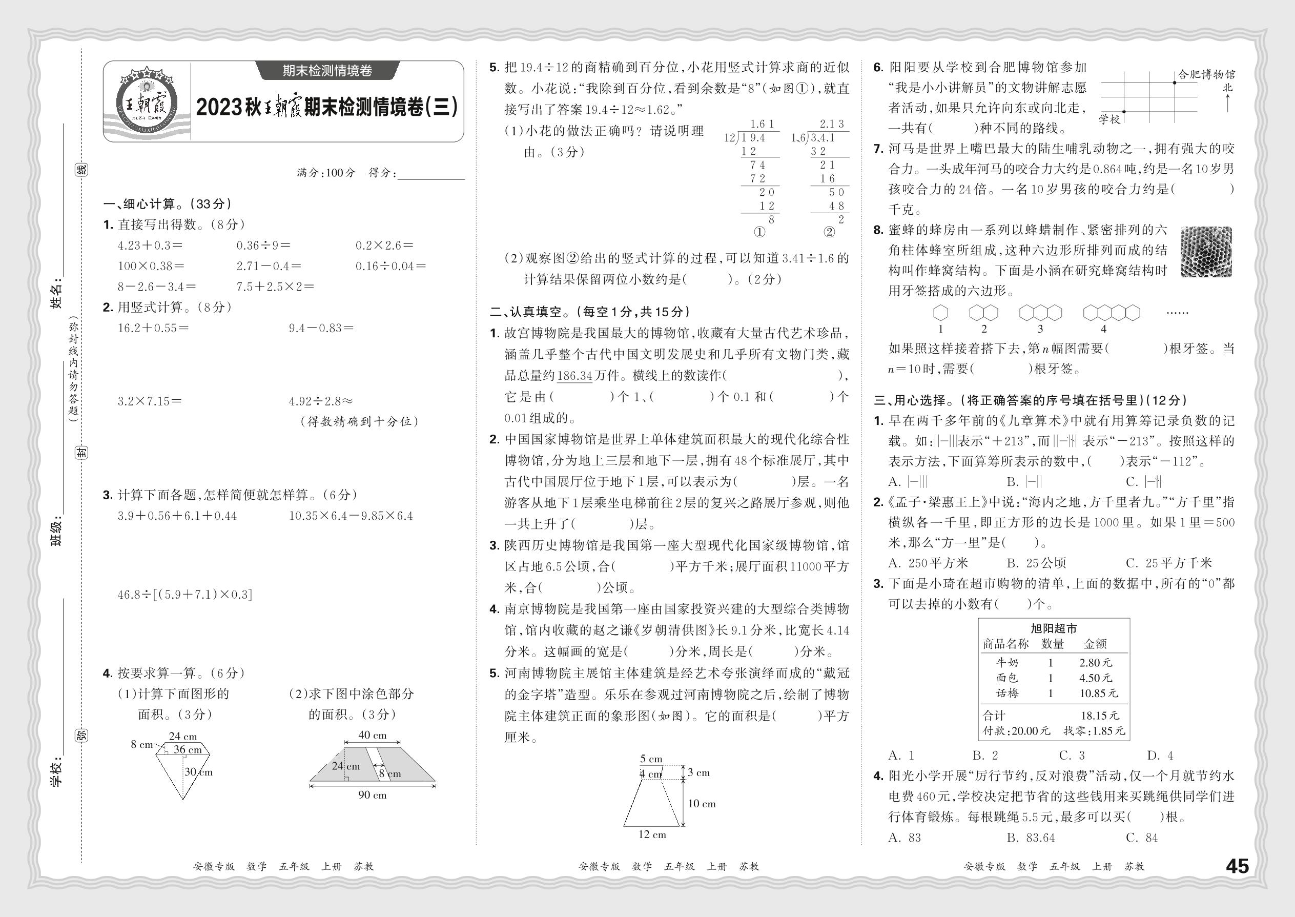 2023秋上册五年级数学苏教版 王朝霞期末检测情境卷(三)