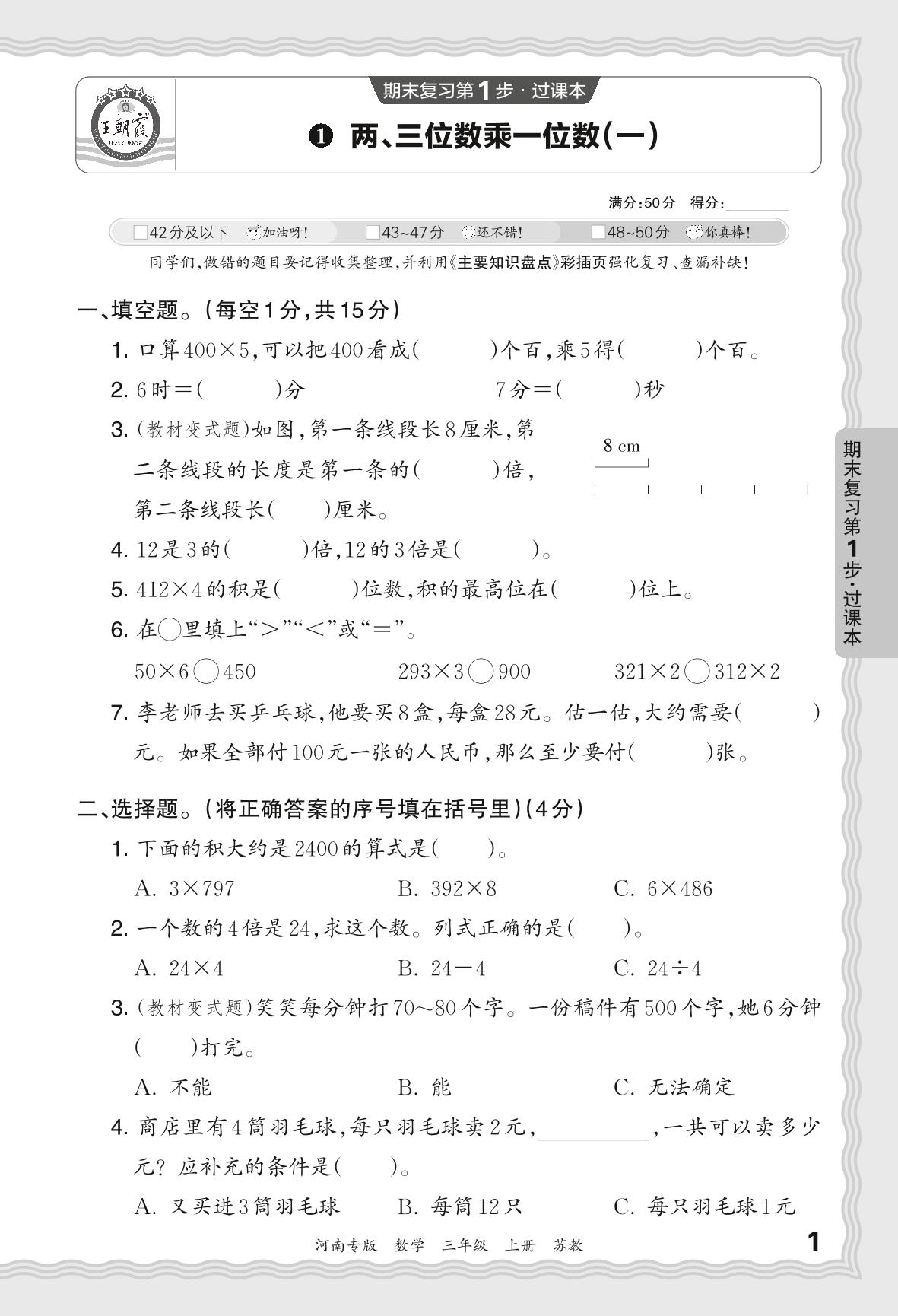 2023秋上册三年级数学苏教版 期末过课本QMA版·两、三位数乘一位数(一)【1】