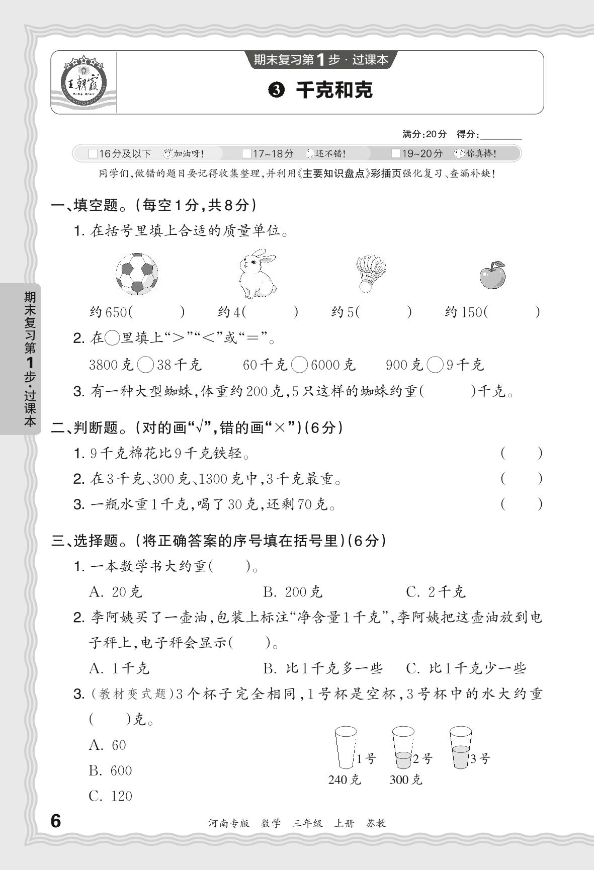 2023秋上册三年级数学苏教版 期末过课本QMA版·千克与克【3】
