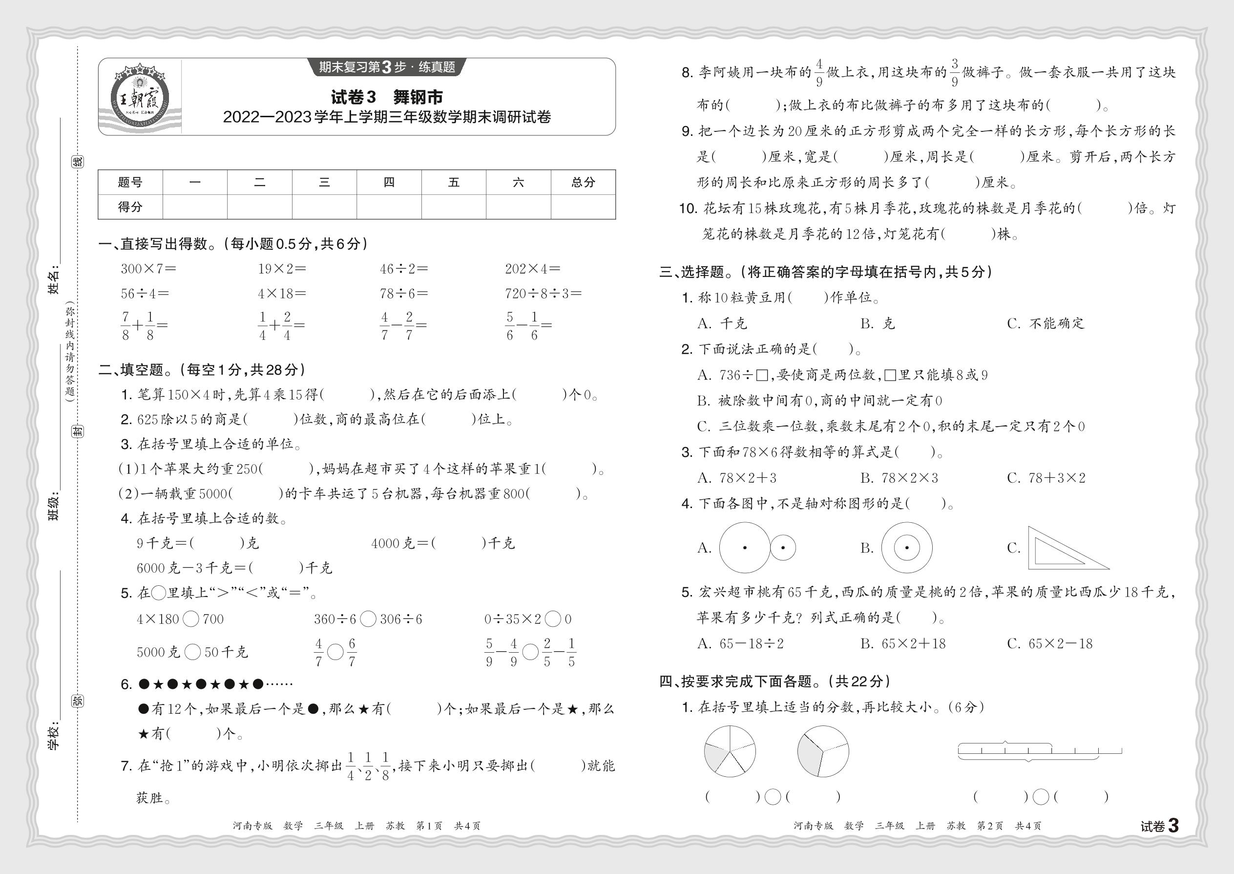 河南省平顶山市舞钢市2022—2023学年上学期三年级数学期末调研试卷(苏教版)【3】
