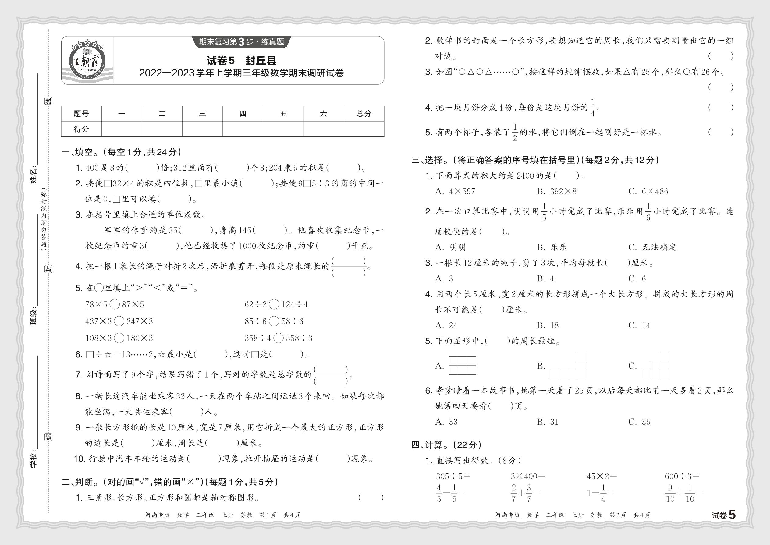 河南省新乡市封丘县2022—2023学年上学期三年级数学期末调研试卷(苏教版)【5】
