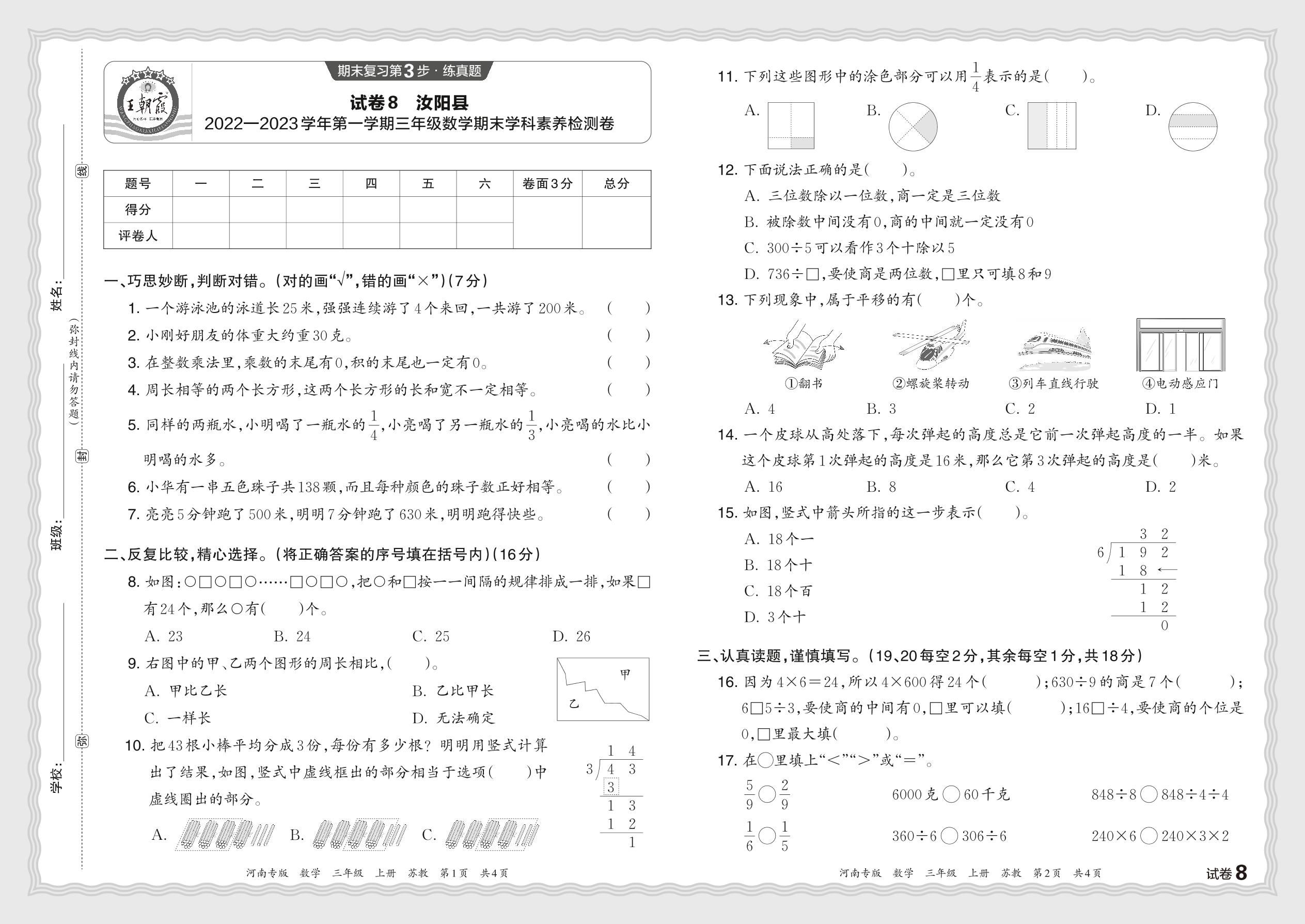 河南省洛阳市汝阳县2022—2023学年第一学期三年级数学期末学科素养检测卷(苏教版)【8】