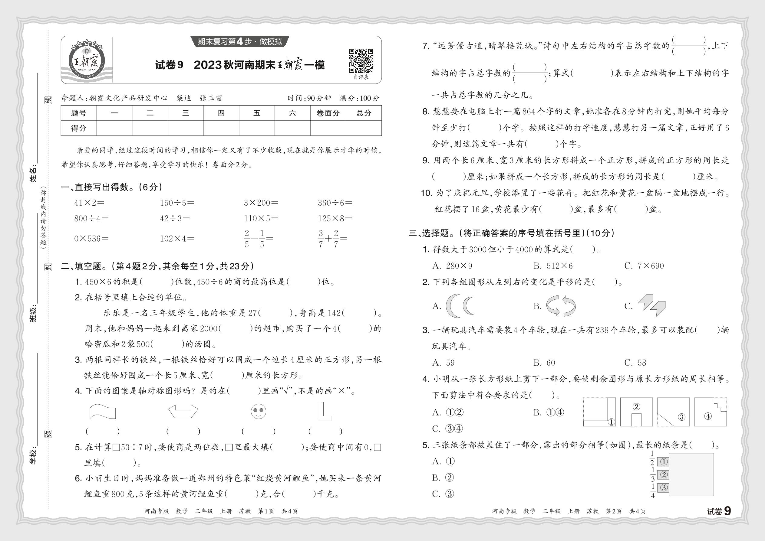 2023秋上册三年级数学苏教版 河南期末王朝霞一模【9】
