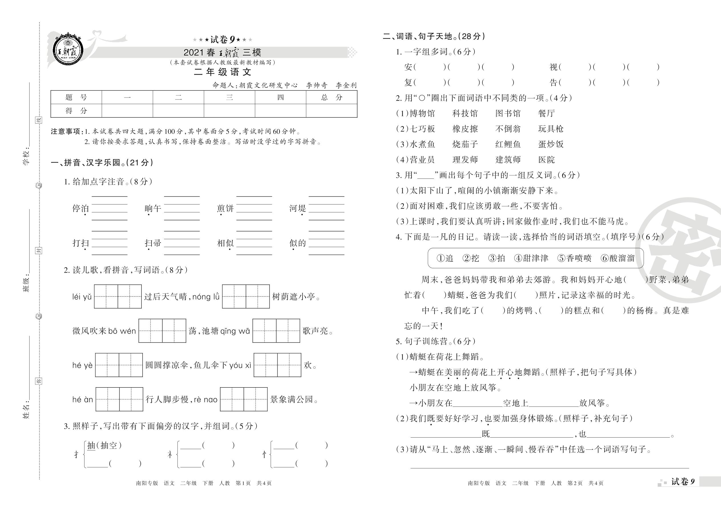 王朝霞期末模拟卷二年级下册语文(人教版)_R21080163742【9】