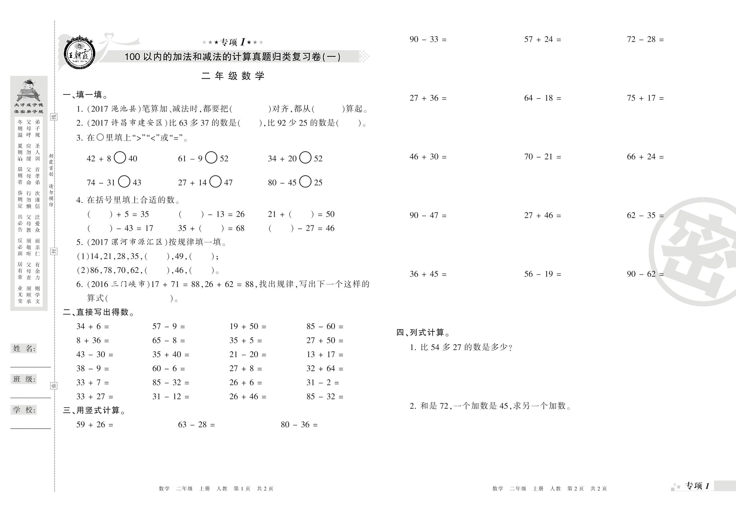 王朝霞期末专项卷——100以内的加法和减法的计算(一)(二)真题归类复习卷二年级上册数学(人教版)_R210803103920【0】