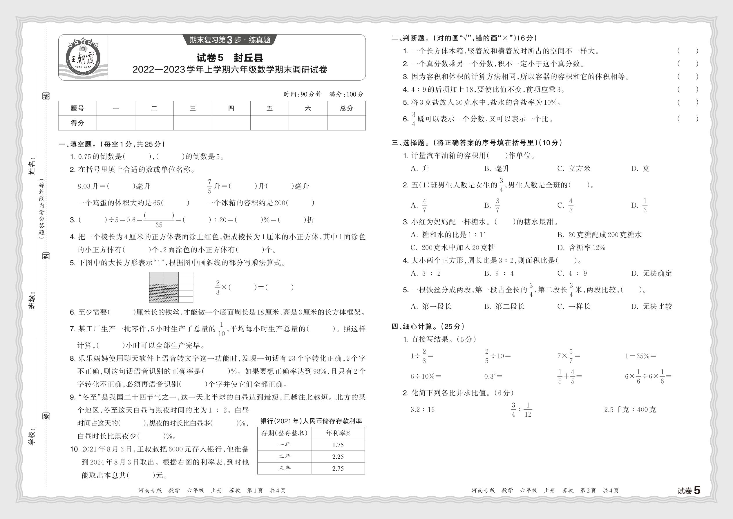 河南省新乡市封丘县2022—2023学年上学期六年级数学期末调研试卷(苏教版)【5】