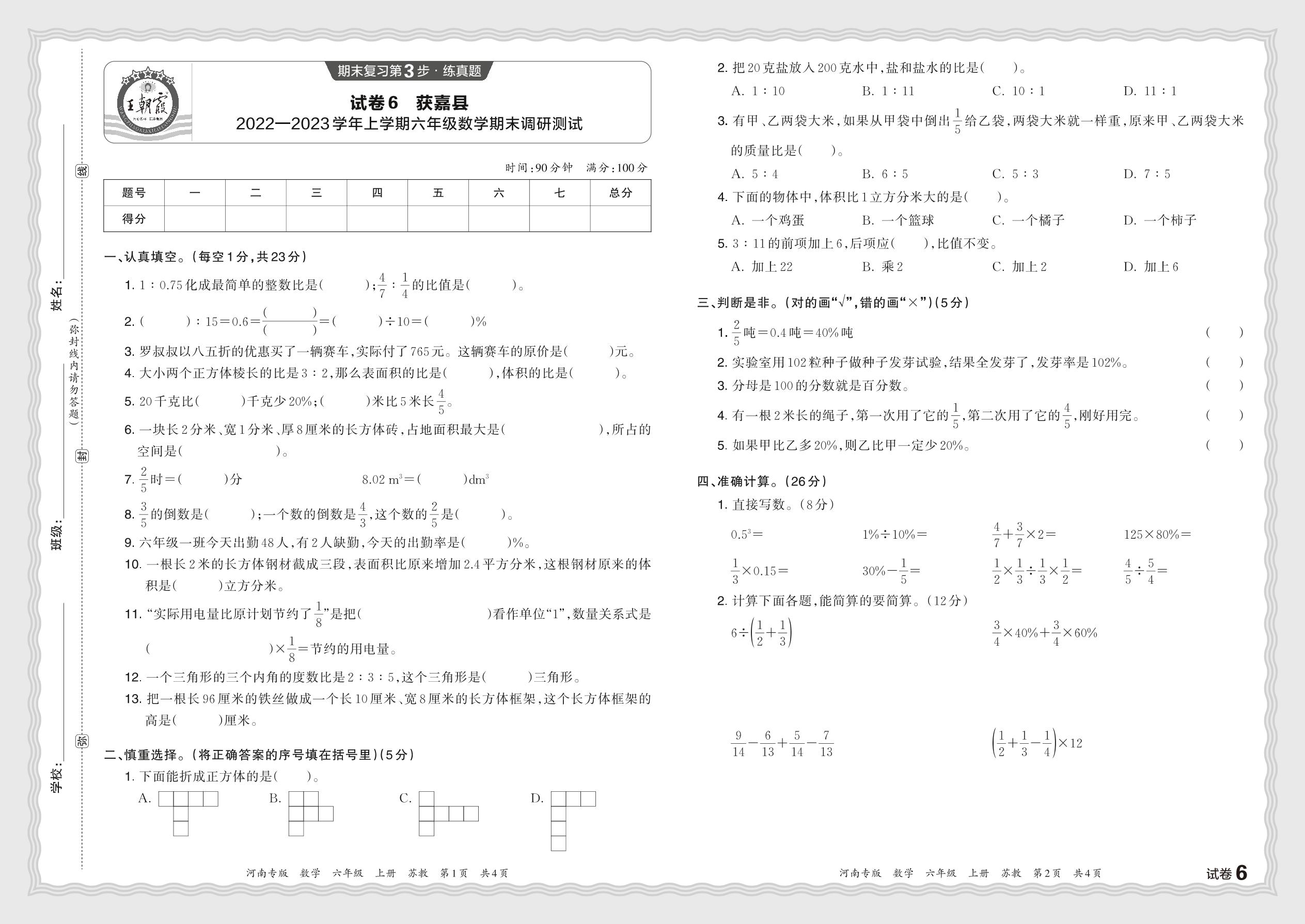 河南省新乡市获嘉县2022—2023学年上学期六年级数学期末调研测试(苏教版)【6】