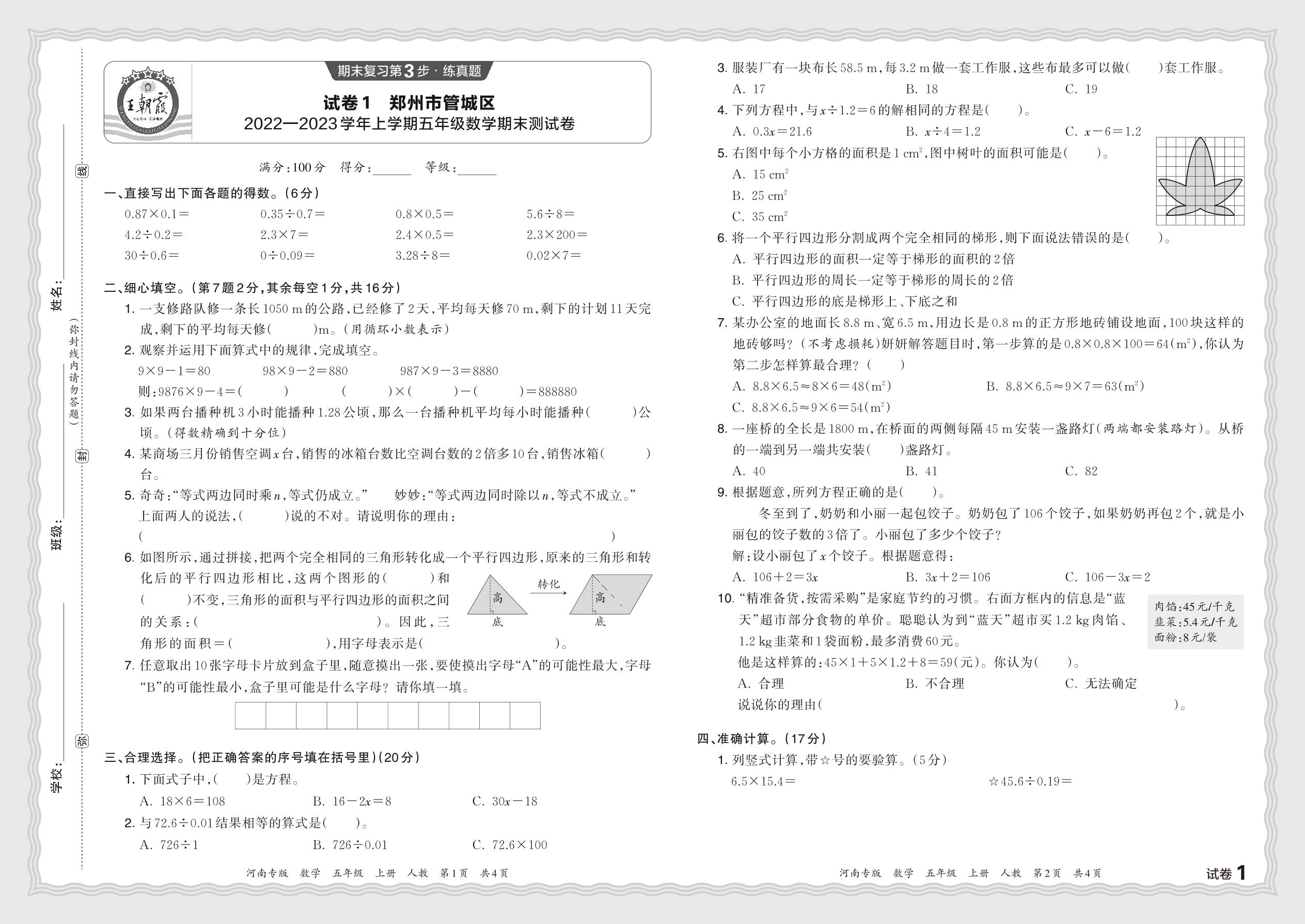 河南省郑州市管城区2022—2023学年上学五年级数学期末测试卷(人教版)【1】