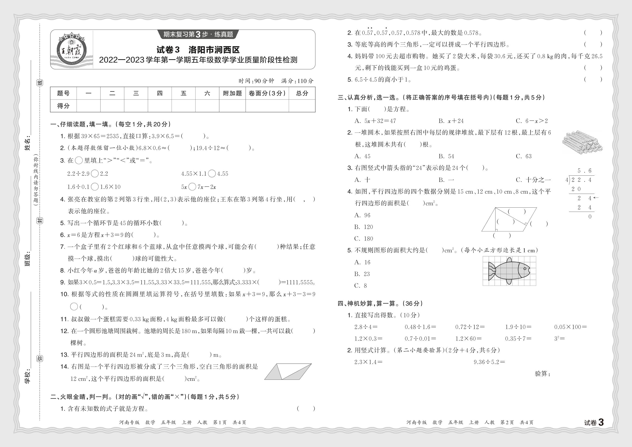 河南省洛阳市涧西区2022—2023学年第一学期五年级数学学业质量阶段性检测(人教版)【3】