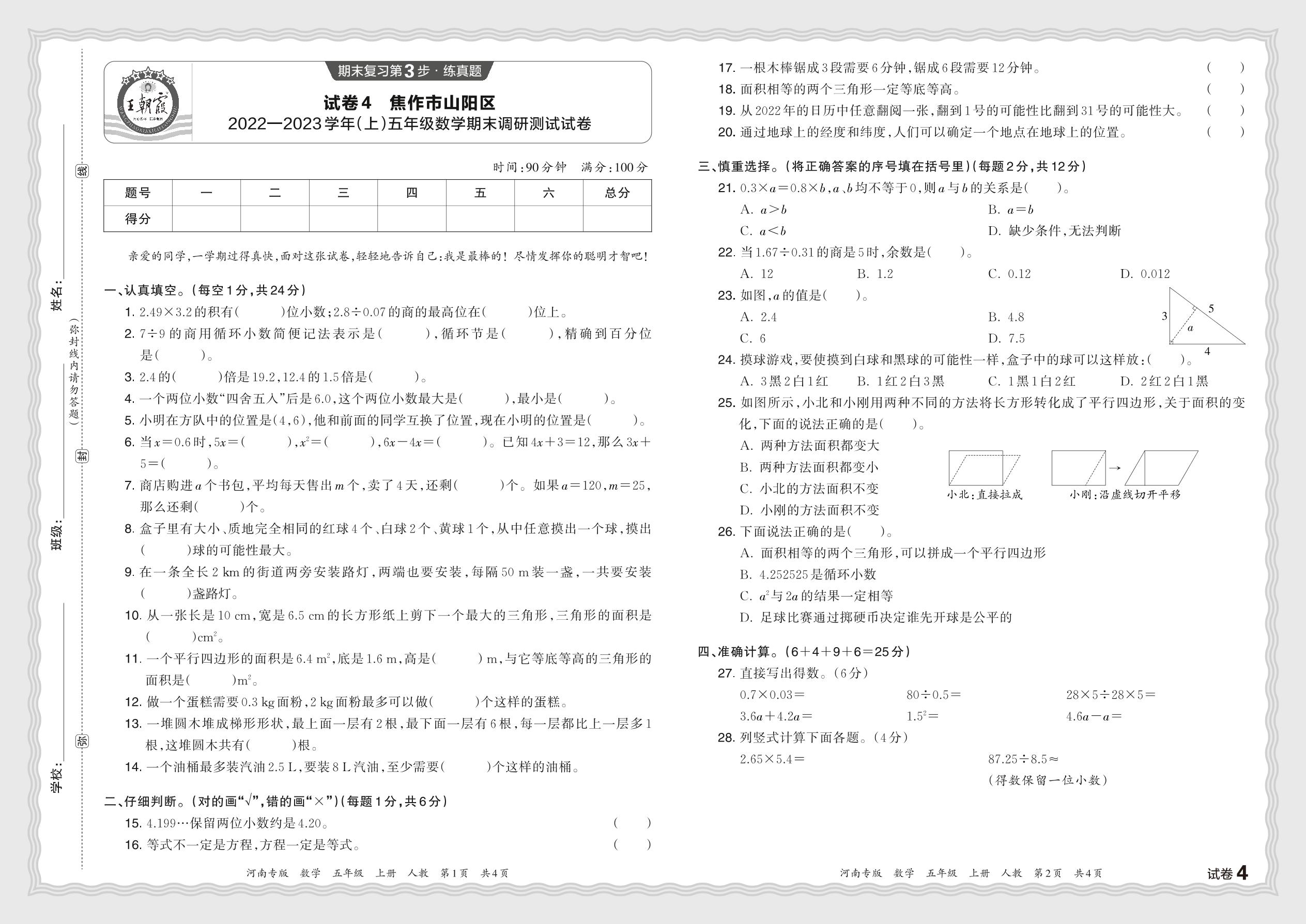 河南省焦作市山阳区2022—2023学年(上)五年级数学期末调研测试试卷(人教版)【4】
