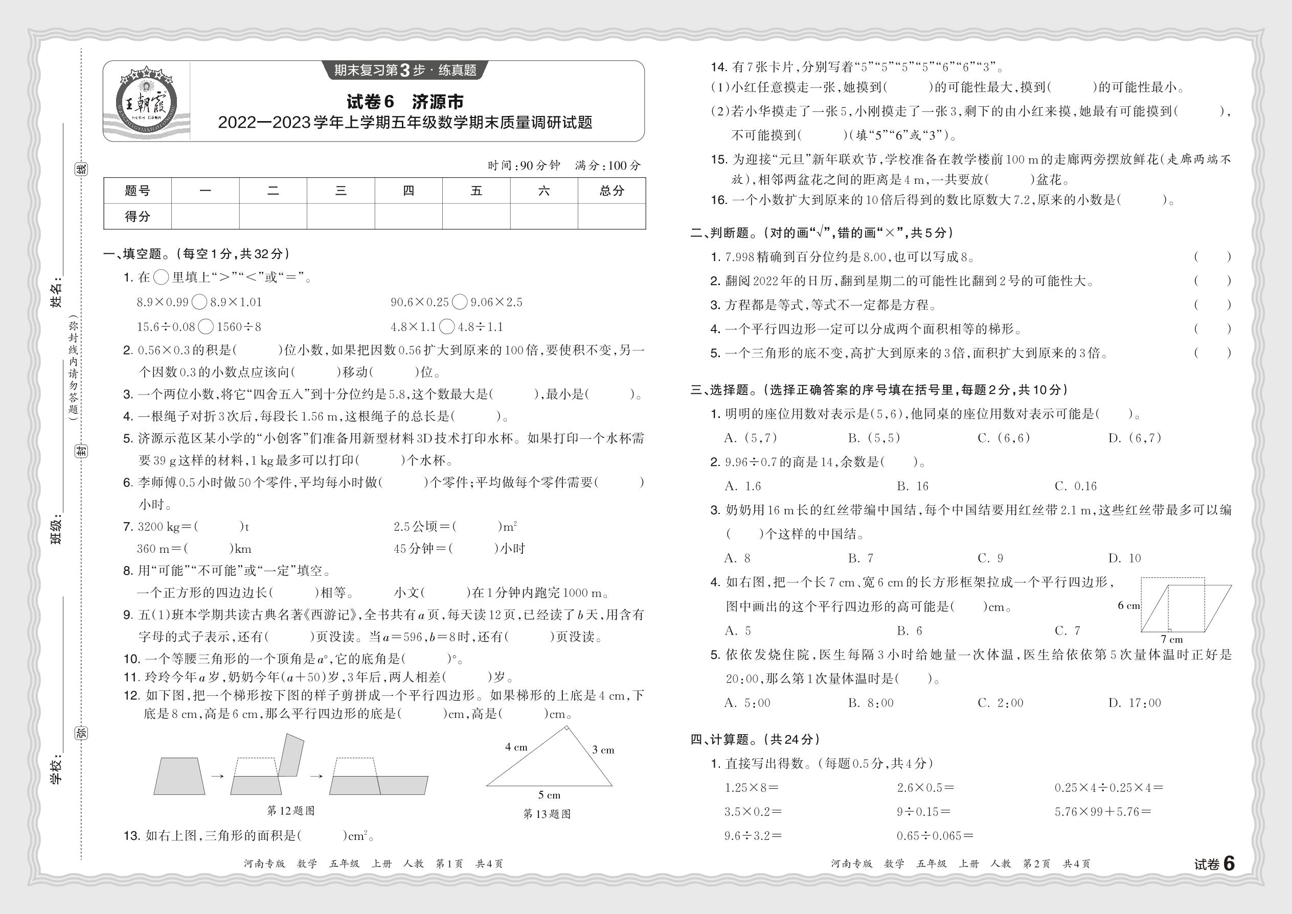 河南省济源市2022—2023学年上学期五年级数学期末质量调研试题(人教版)【6】