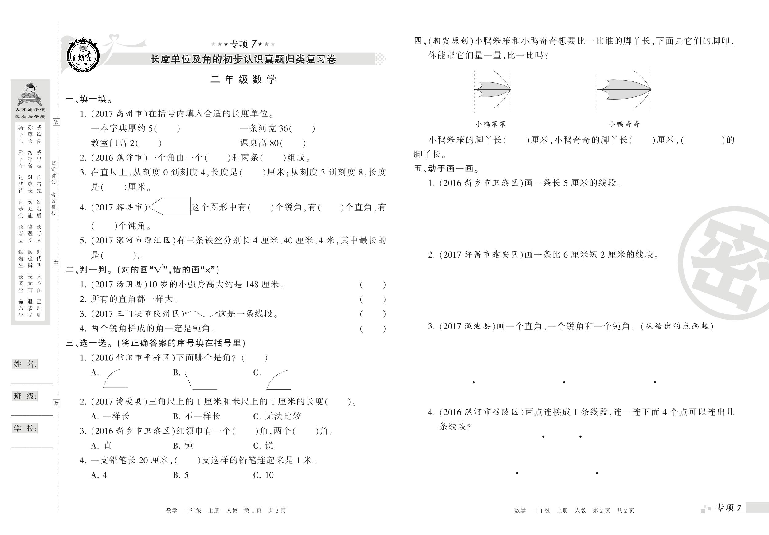 王朝霞期末专项卷——长度单位及角的初步认识、认识时间、观察物体及搭配真题归类复习卷二年级上册数学(人教版)_R210803103927【0】