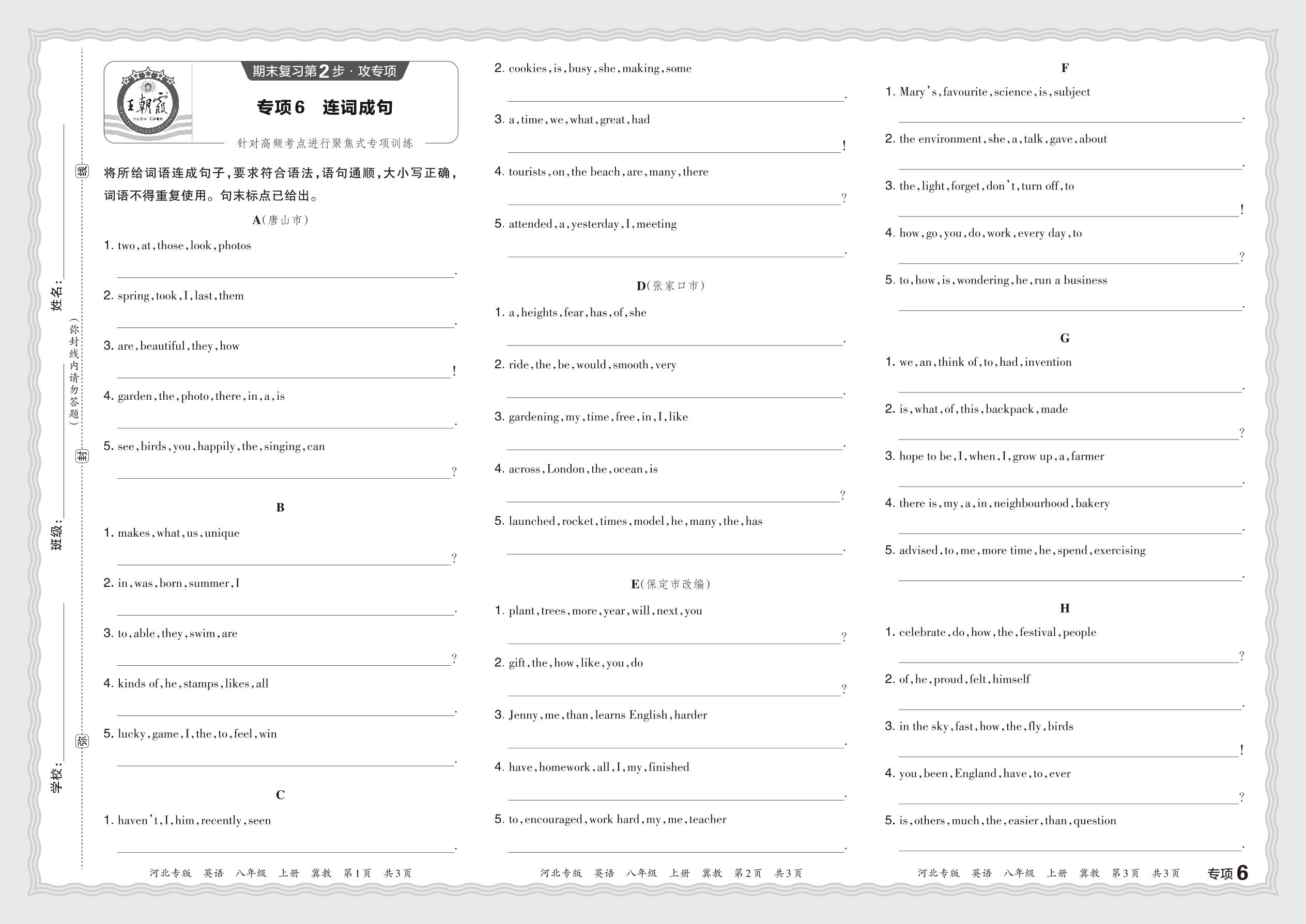 2023秋上册八年级英语冀教版 期末专项卷·连词成句【6】