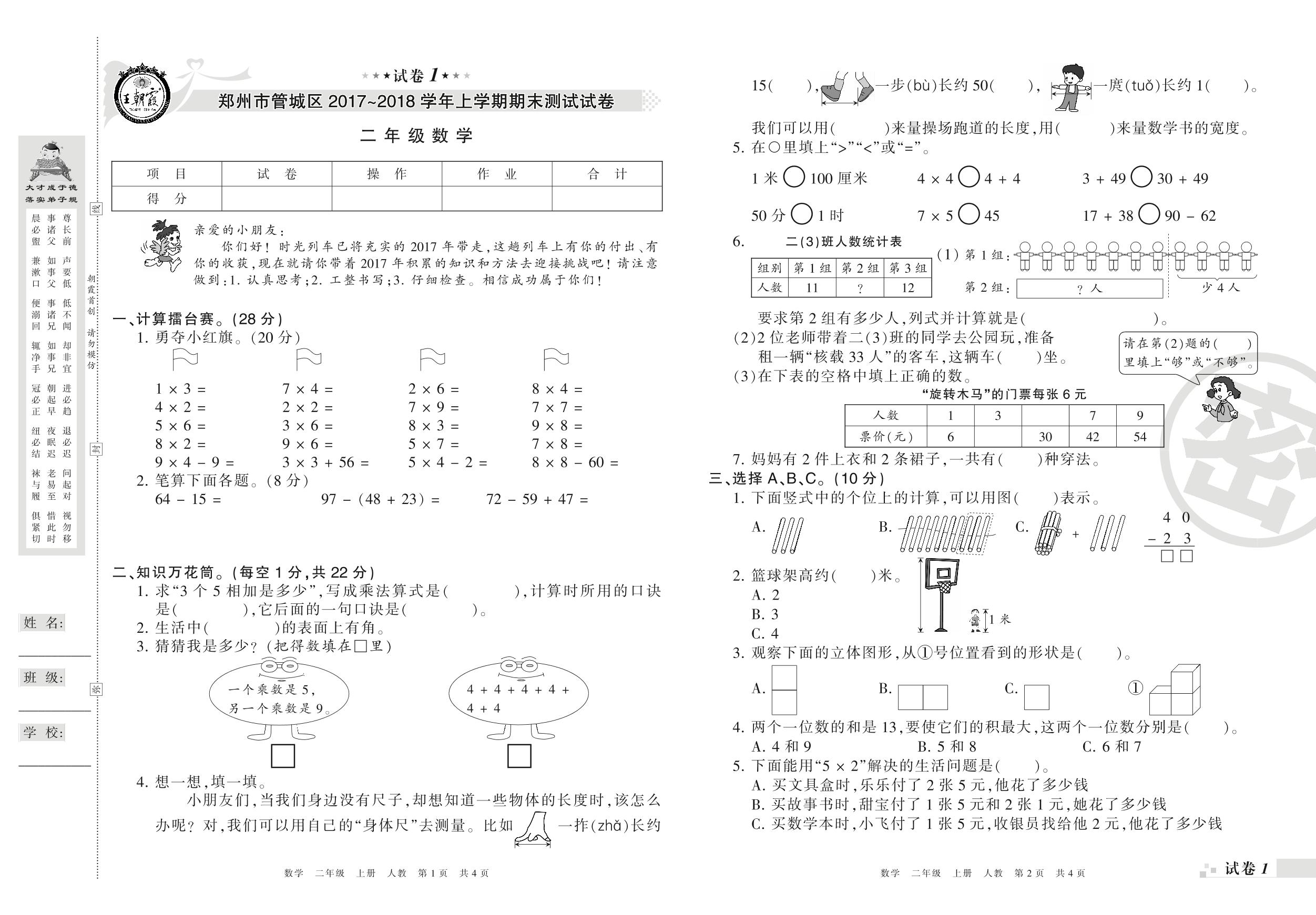 2017-2018学年第一学期郑州市管城区二年级数学试卷(人教版)【1】